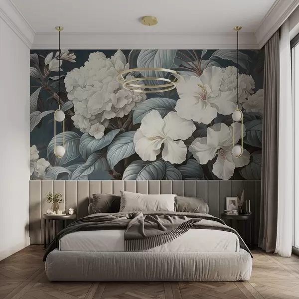 Fototapet Flori tropicale albe cu petale delicate și frunze pe un fundal albastru închis, stil vintage texturat, ilustrație botanică Nr. w09334