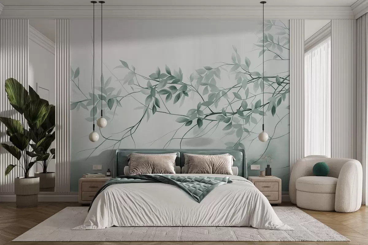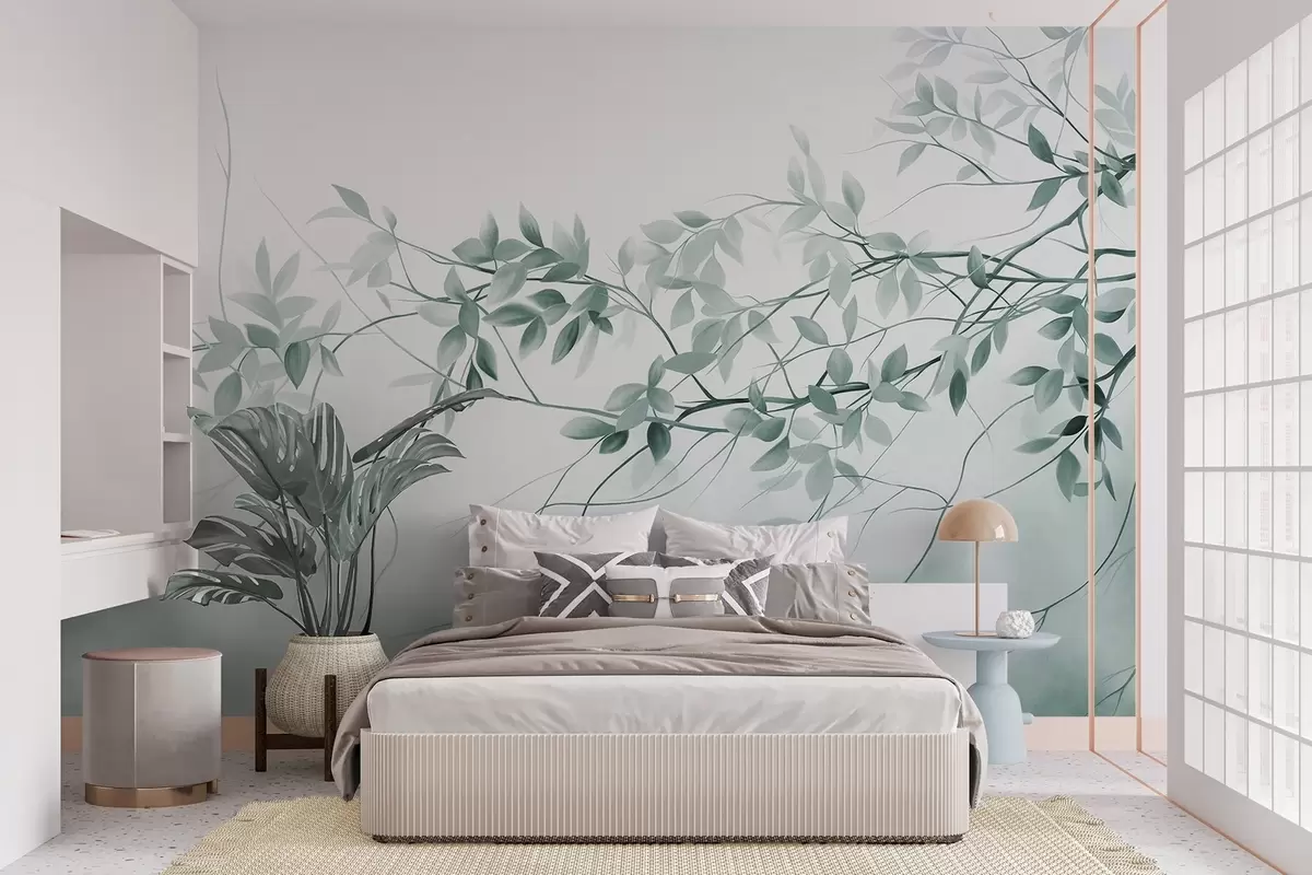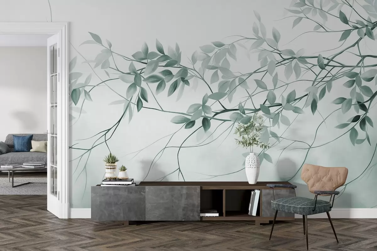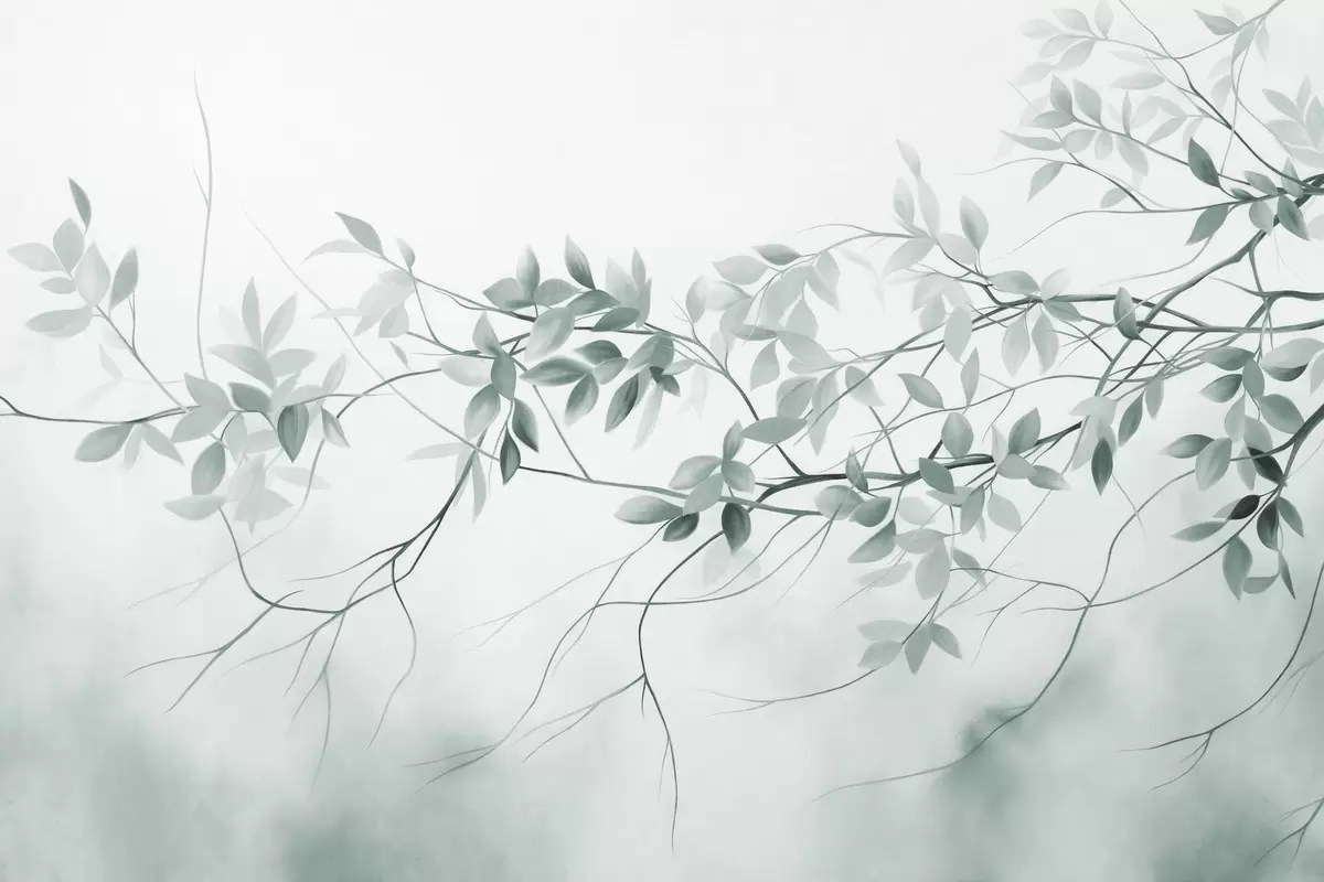 Fototapet Ramuri cu textură delicată, cu frunze de culoare gri și verde estompat, pe un fundal moale și neclar. Nr. w09336v1