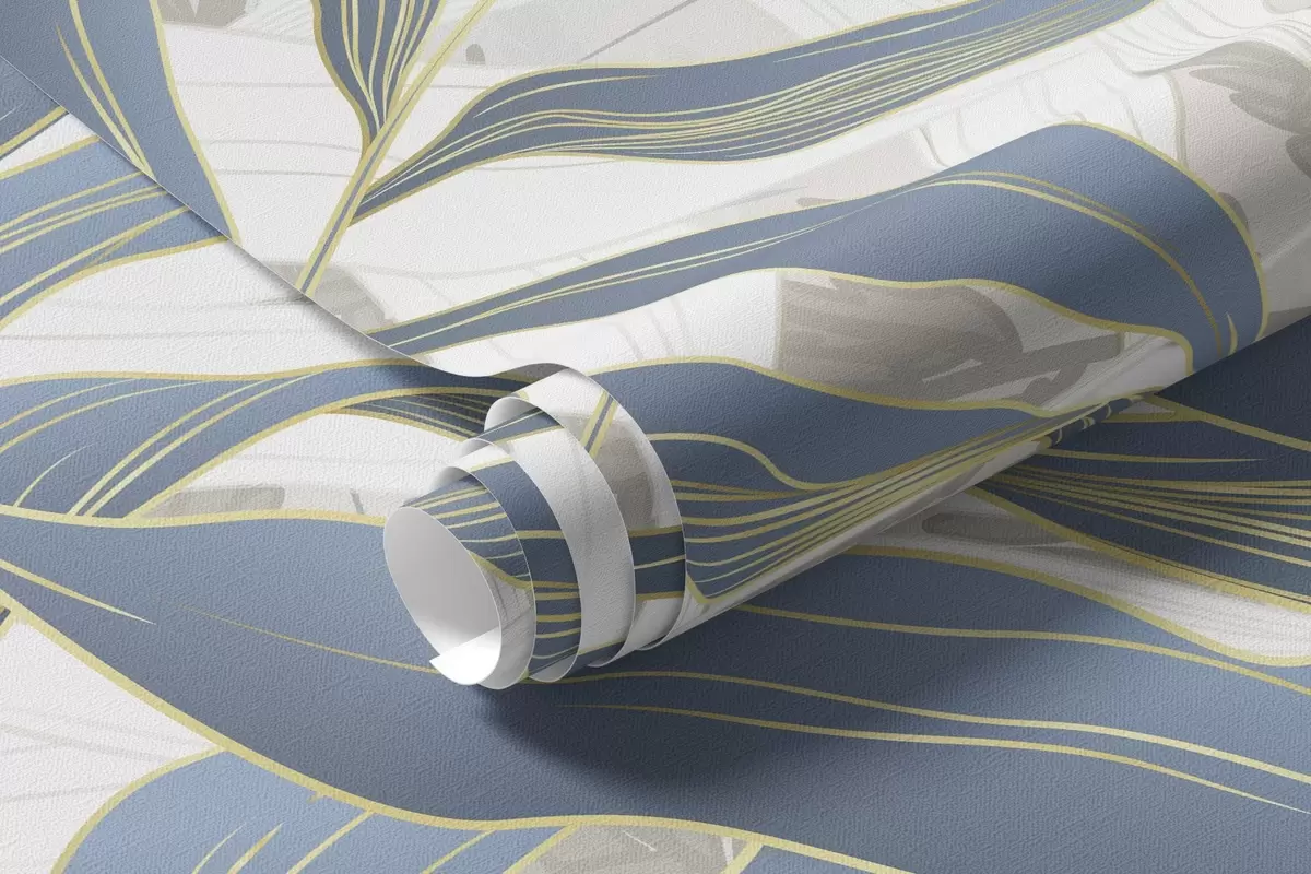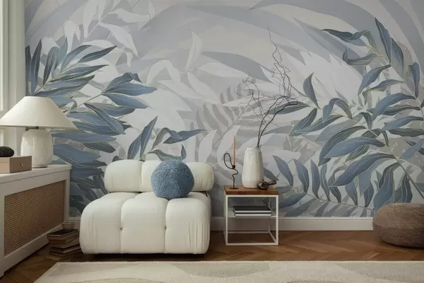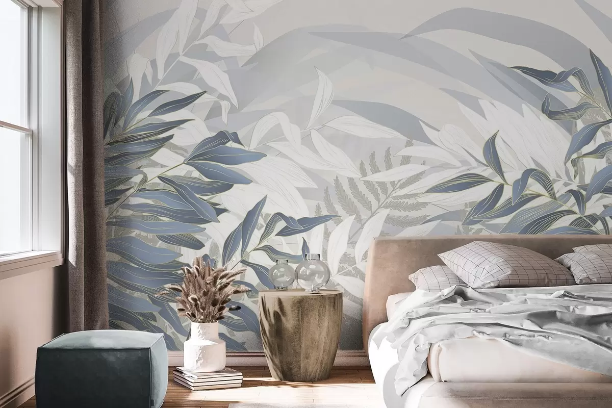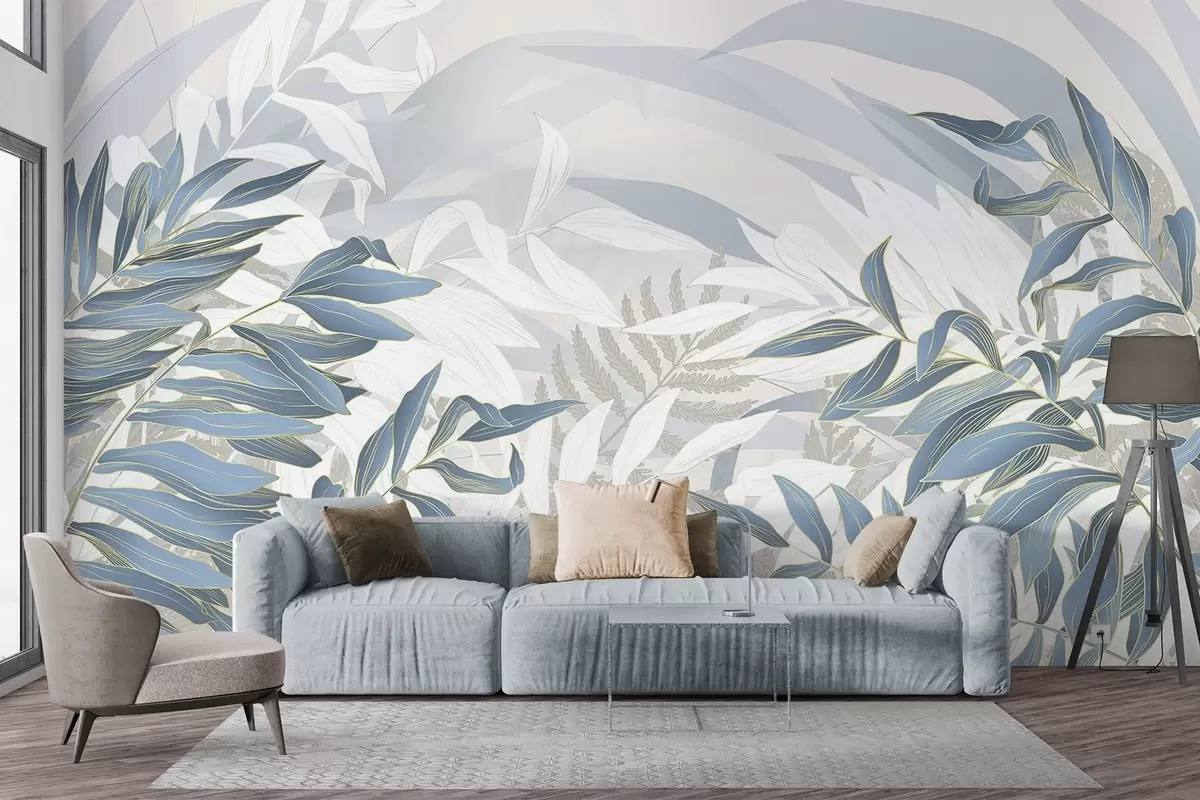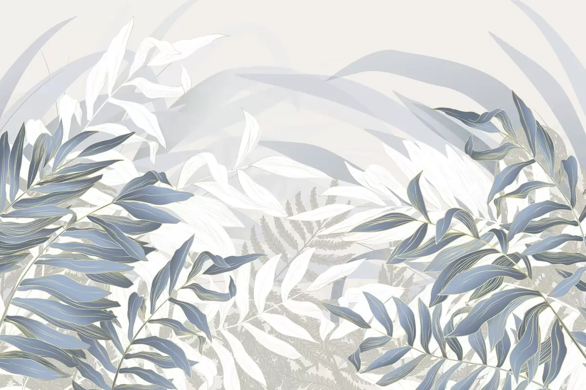 Fototapet Albastru și frunze albe și iarbă, culori pastelate moi, ilustrație botanică, design minimalist, decorativ, modern Nr. w09341
