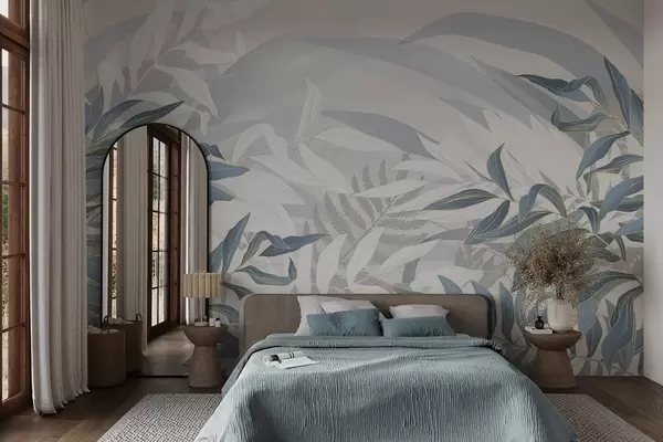 Fototapet Albastru și frunze albe și iarbă, culori pastelate moi, ilustrație botanică, design minimalist, decorativ, modern Nr. w09341