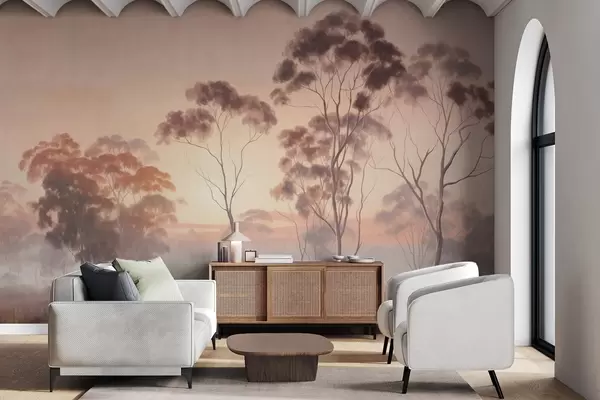 Fototapet Un peisaj cu copaci eucalipt într-un câmp cu pastel roz și portocaliu cer, o ceață ușoară, pictura stil texturat Nr. w09367