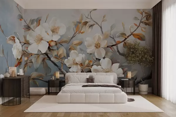 Fototapet Flori albe cu pistil galben pe o ramură de copac cu frunze, fundal deschis, stil pictură de epocă, imprimare texturată Nr. w09368
