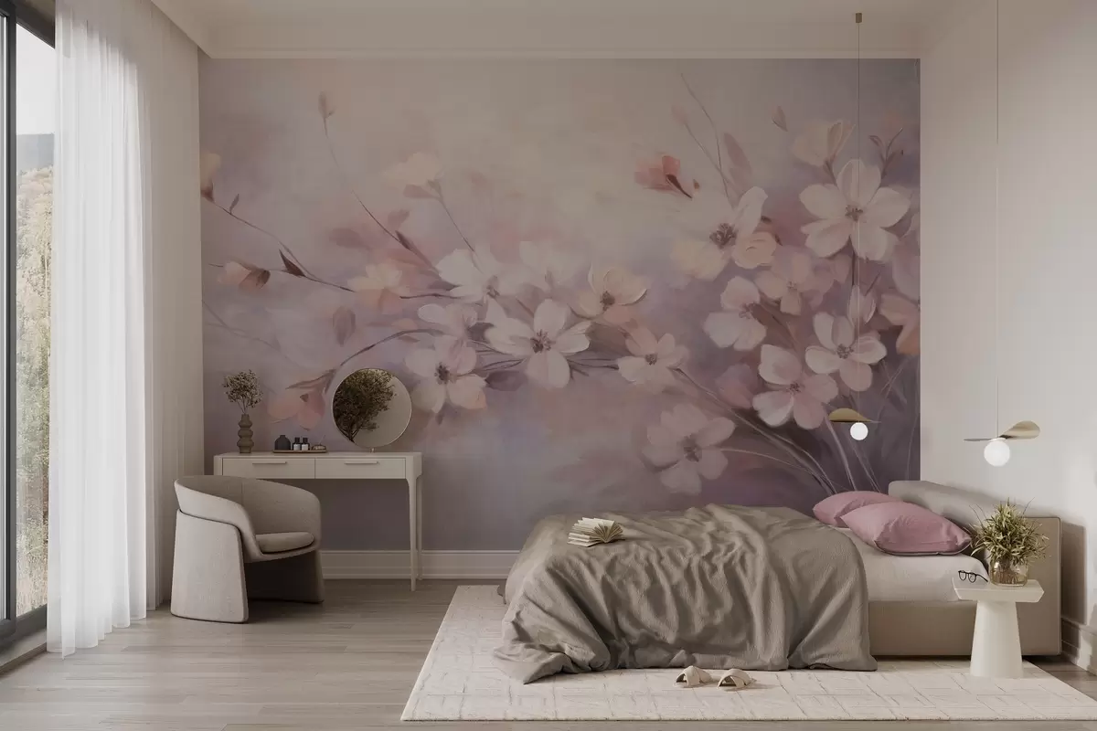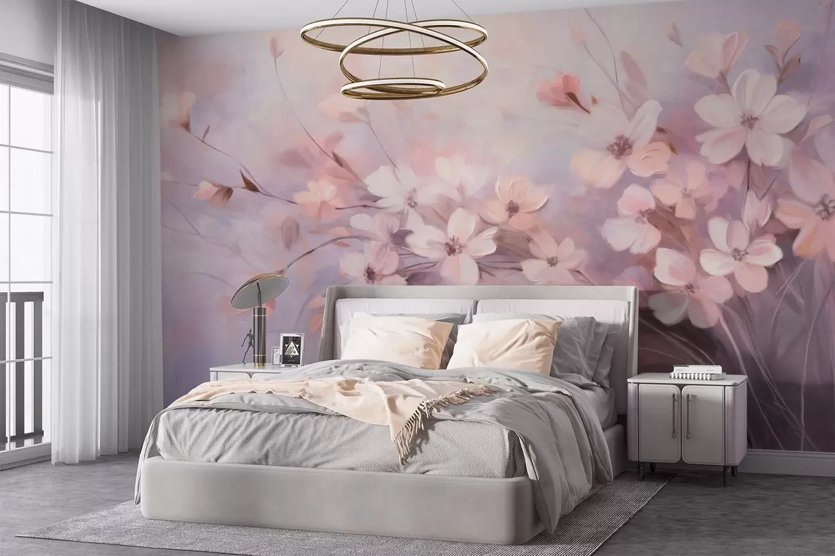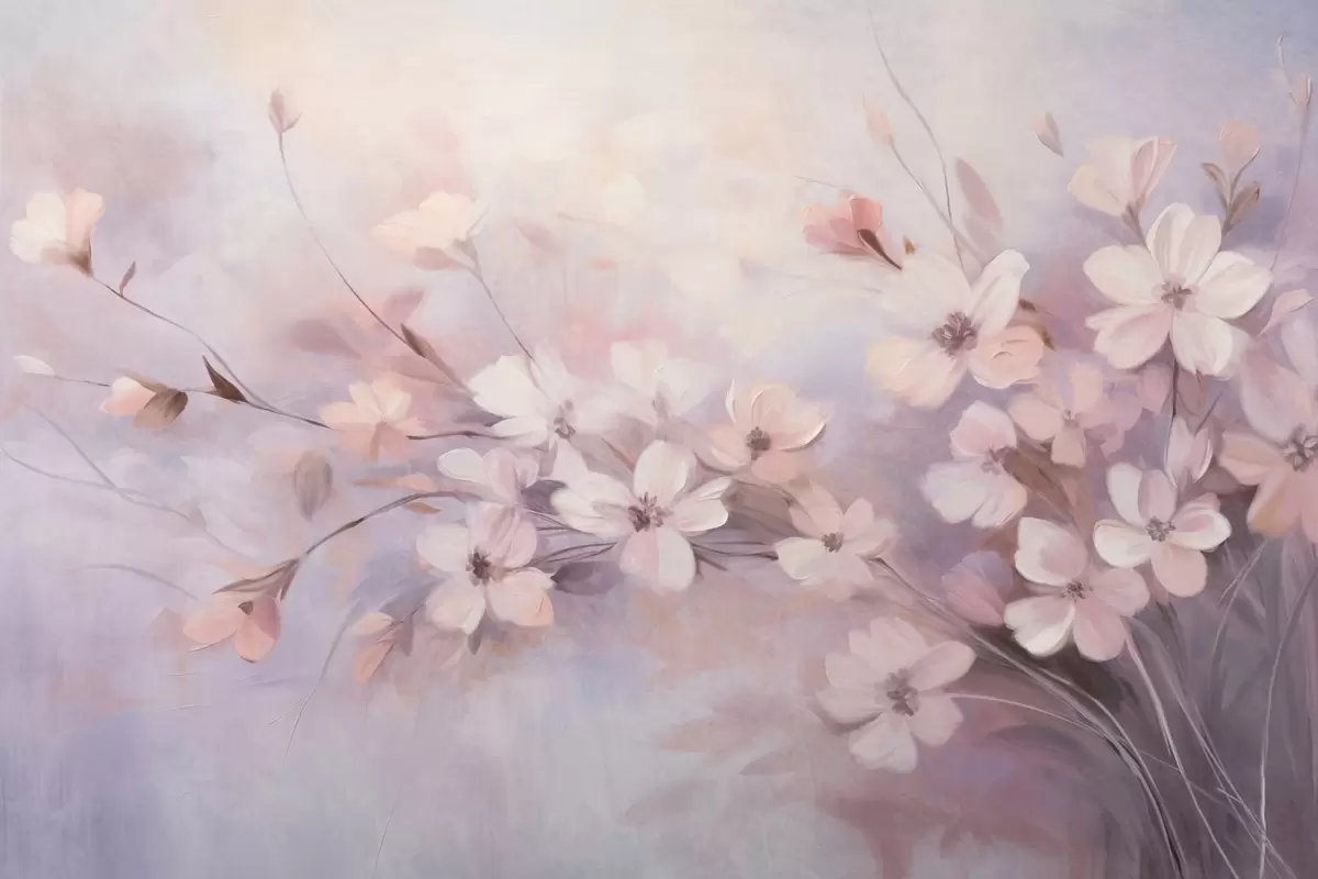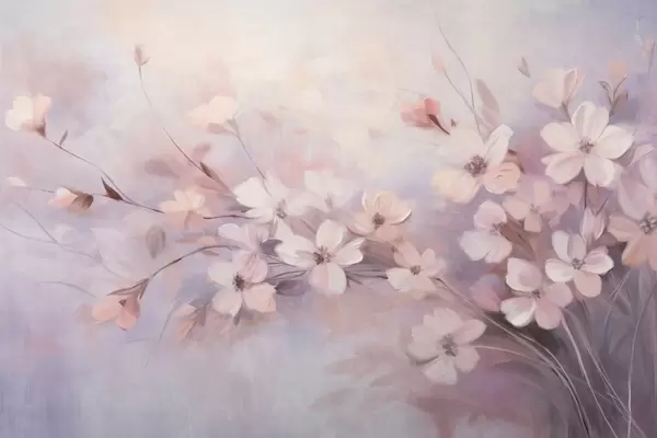 Fototapet Un aranjament floral cu flori delicate, cu margini moi, estompate, pe un fundal pastel de nuanțe de lavandă și roz deschis Nr. w09369