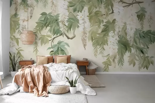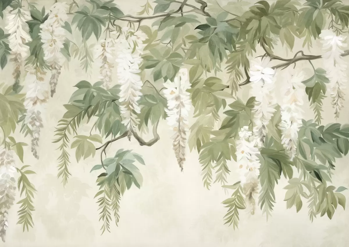 Fototapet Wisteria ramuri cu flori albe și frunze verzi, fundal verde, texturat stil pictura de epocă Nr. w09375