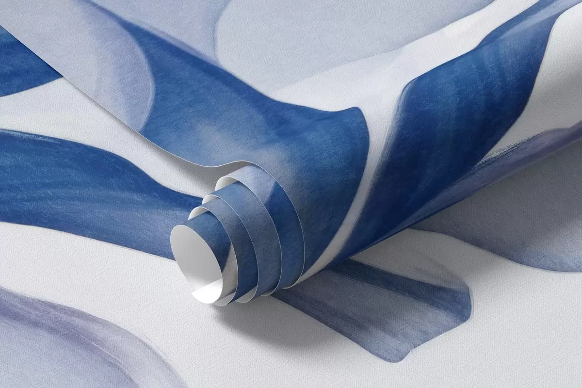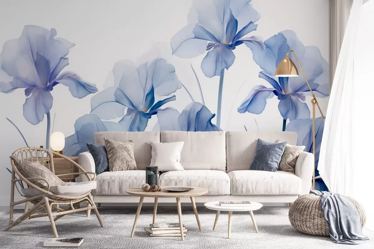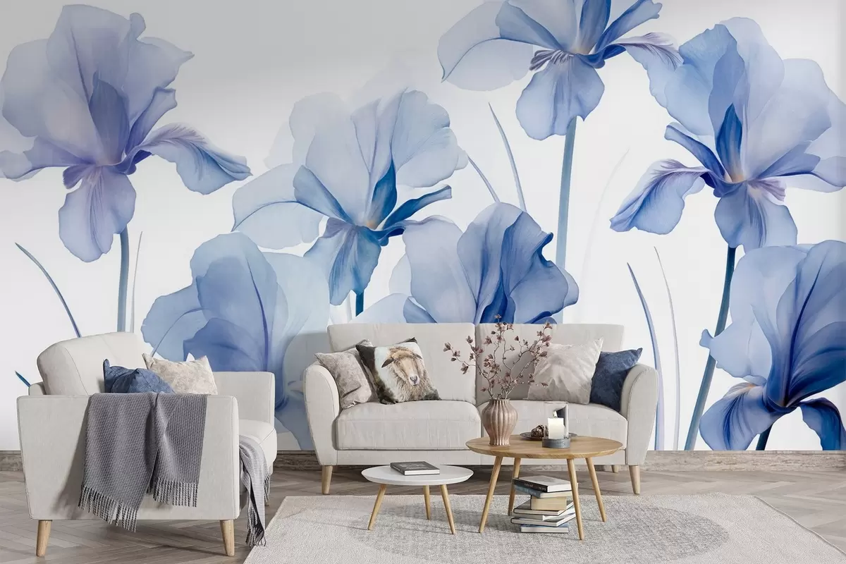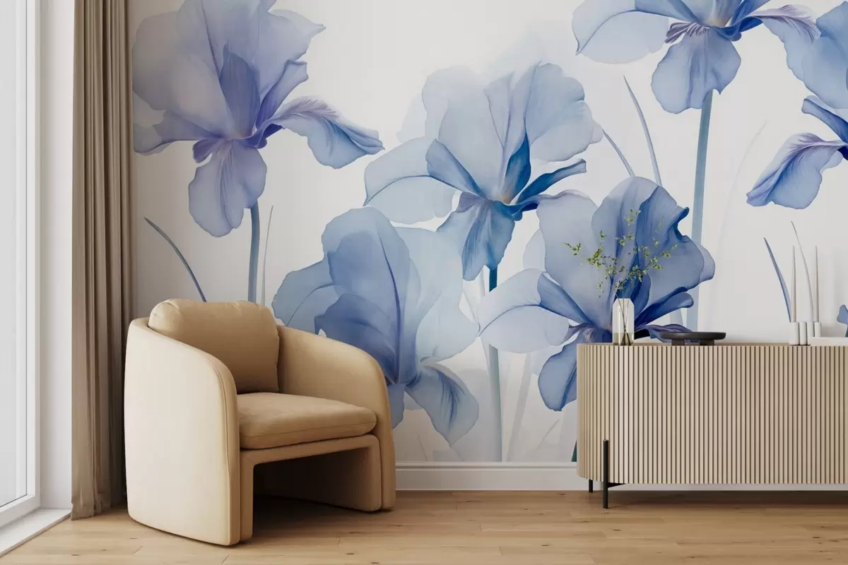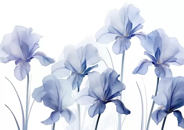 Fototapet Flori de iris albastru cu petale translucide și tulpini lungi, aranjate într-un rând pe un fundal albastru, moale și texturat Nr. w09379