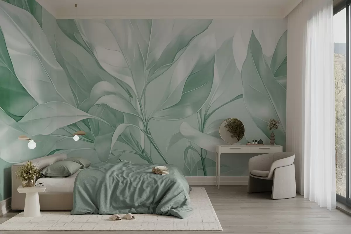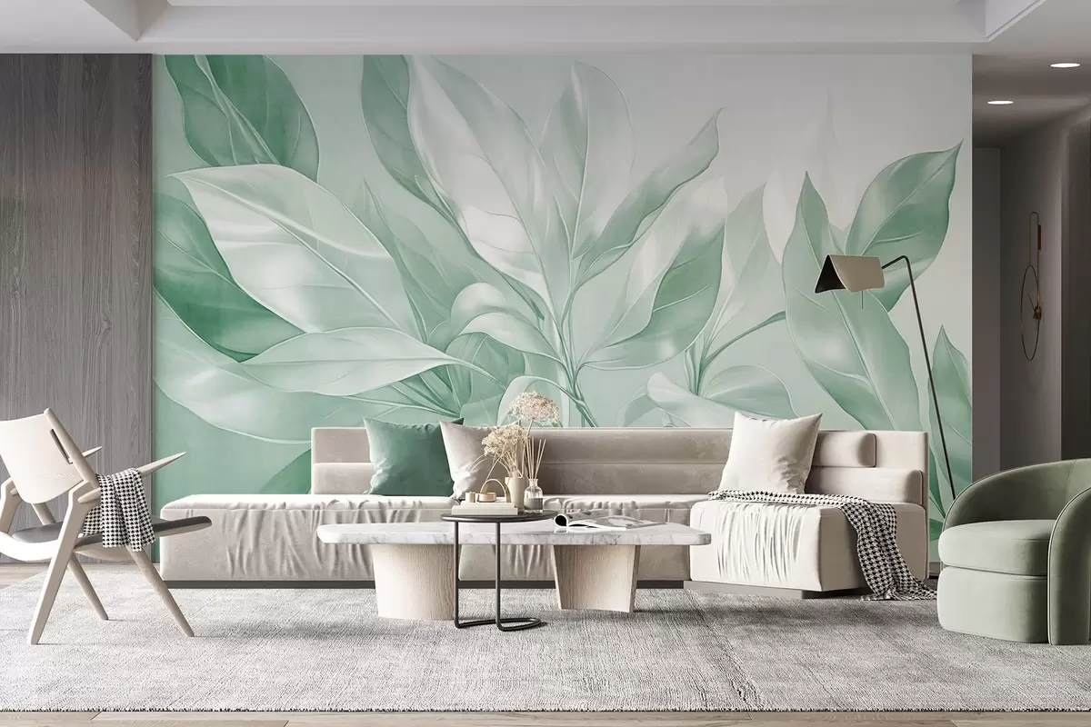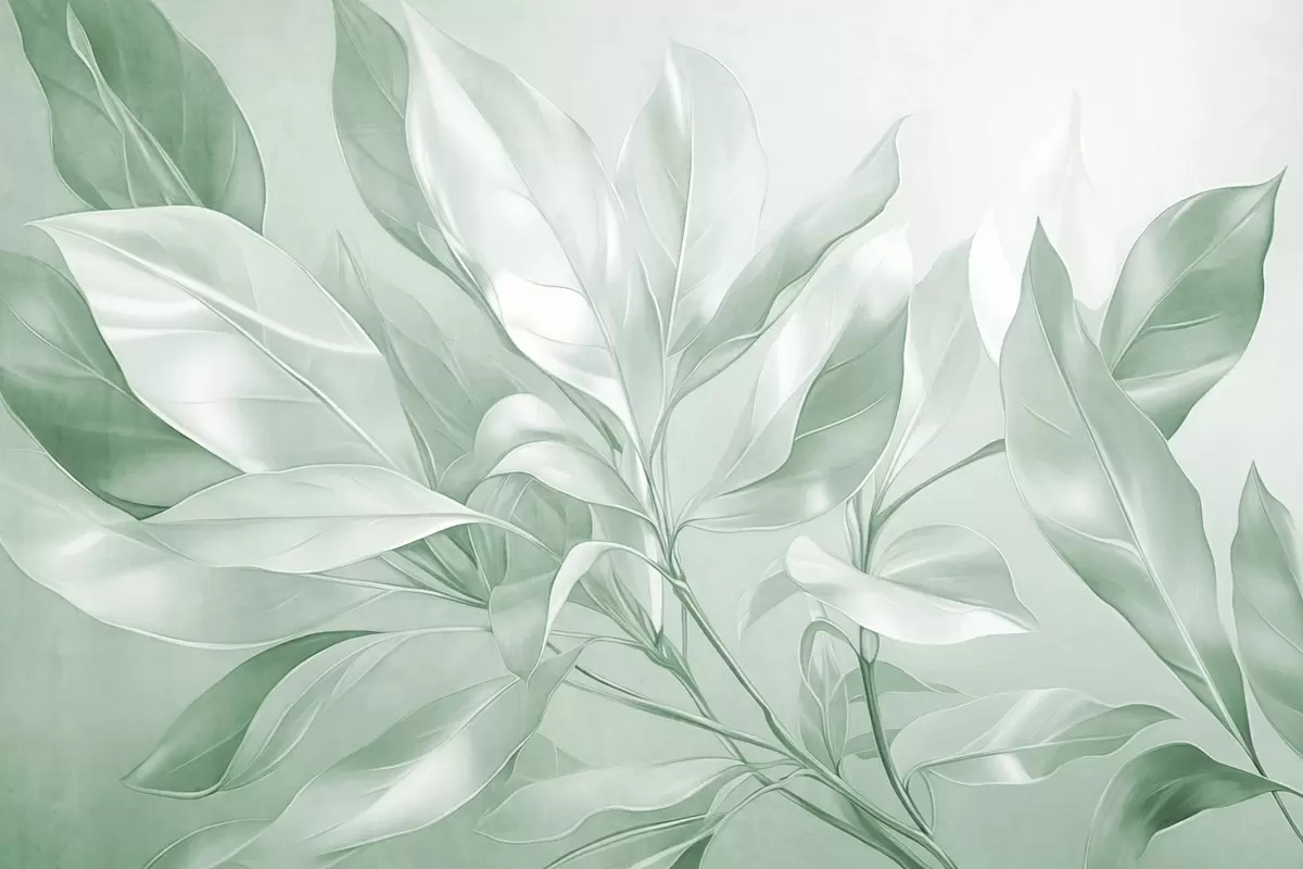 Fototapet Frunze de magnolie cu tonuri de alb și verde, iluminare blândă, compoziție elegantă, nervuri detaliate ale frunzelor, tușe artistice Nr. w09385v1