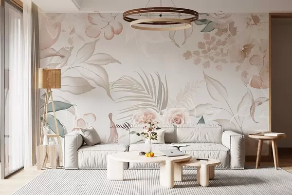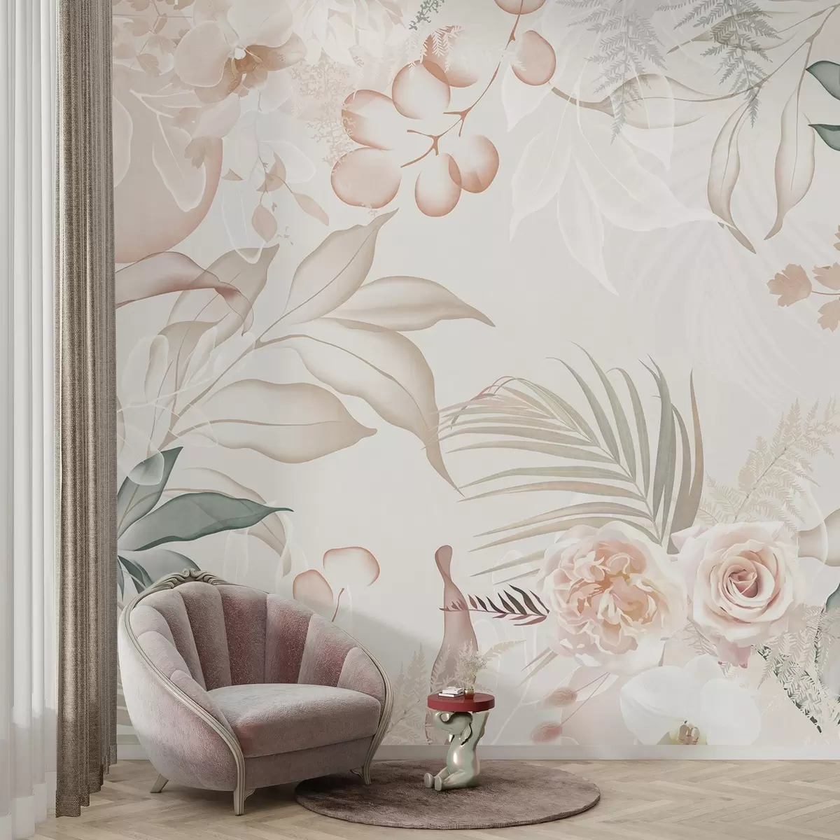 Fototapet Aranjament floral texturat cu trandafiri, orhidee, eucalipt și frunze de palmier în culori pastelate, pe fundal bej Nr. w09393