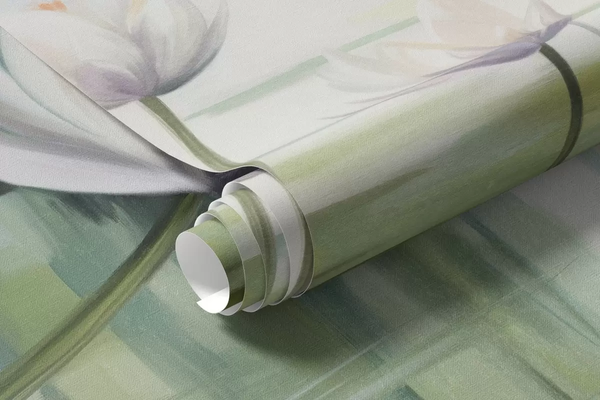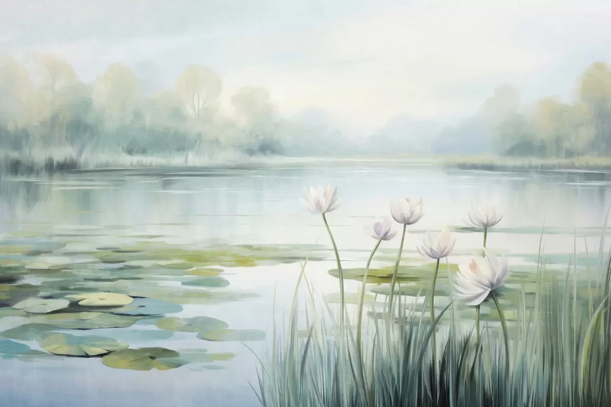 Fototapet Peisaj cu un lac, nuferi și frunze de nufăr, copaci în fundal, într-un mediu calm, în tonuri de albastru deschis și verde Nr. w09395