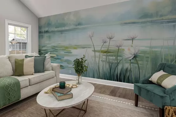 Fototapet Peisaj cu un lac, nuferi și frunze de nufăr, copaci în fundal, într-un mediu calm, în tonuri de albastru deschis și verde Nr. w09395