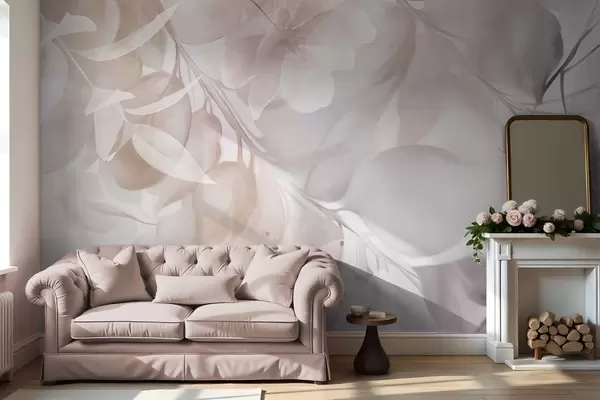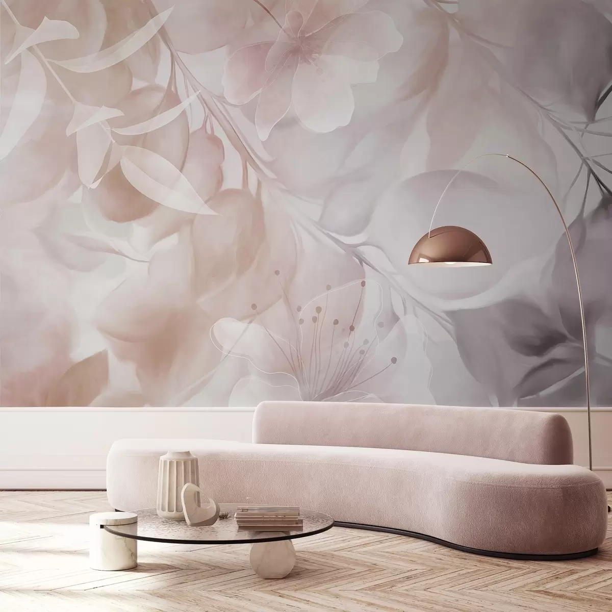 Fototapet Artă florală cu flori, frunze și ramuri în nuanțe discrete de bej și maro, culori pastelate delicate, efect texturat de acuarelă Nr. w09397