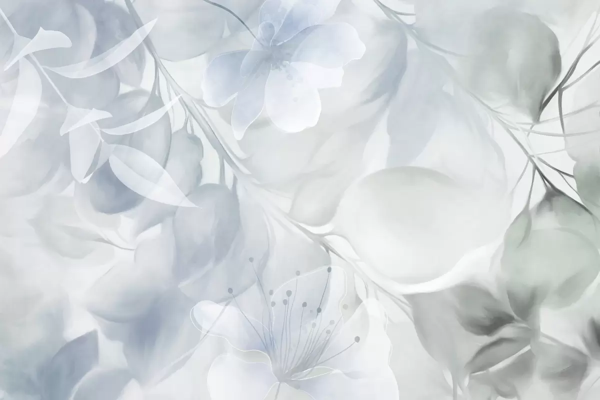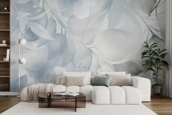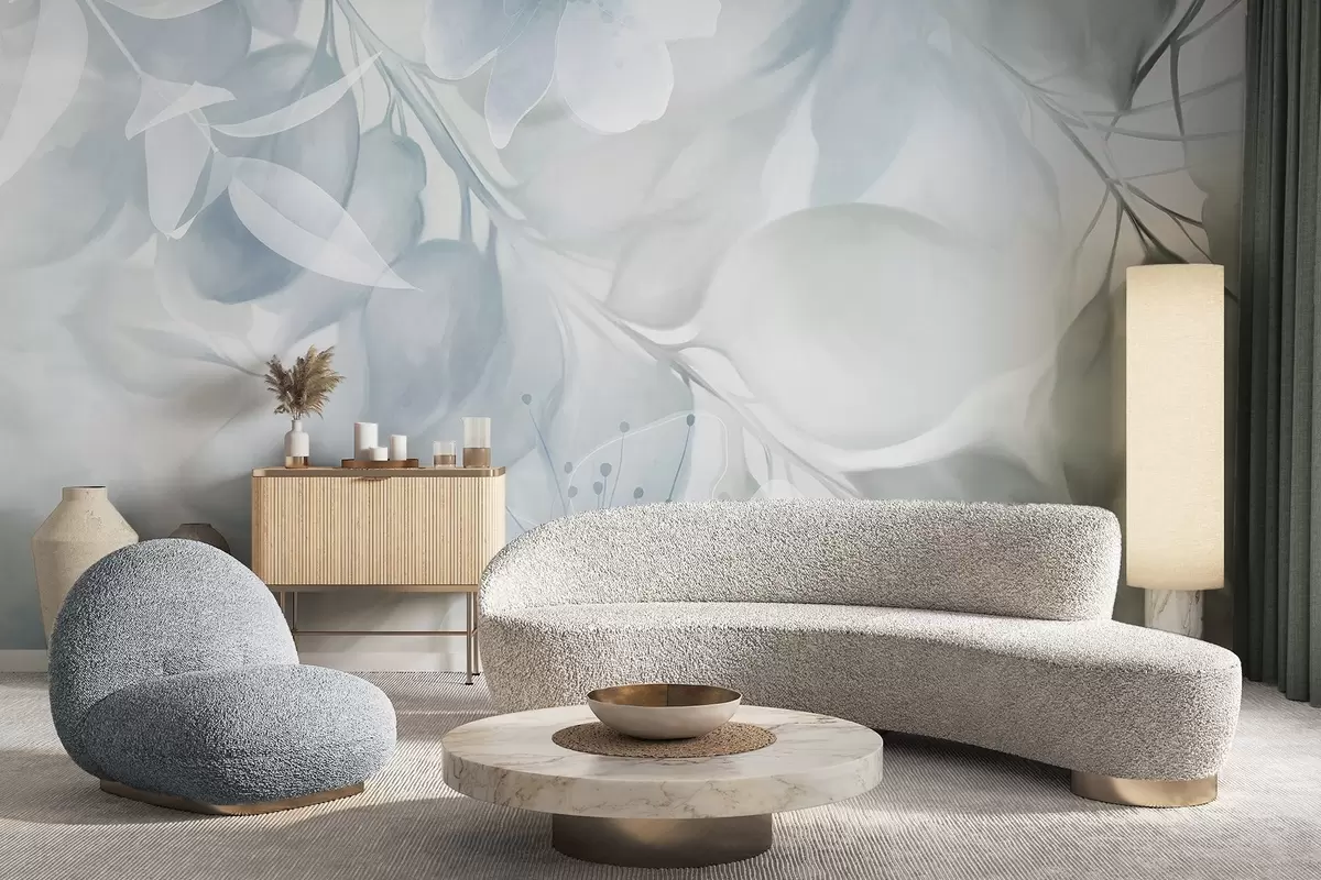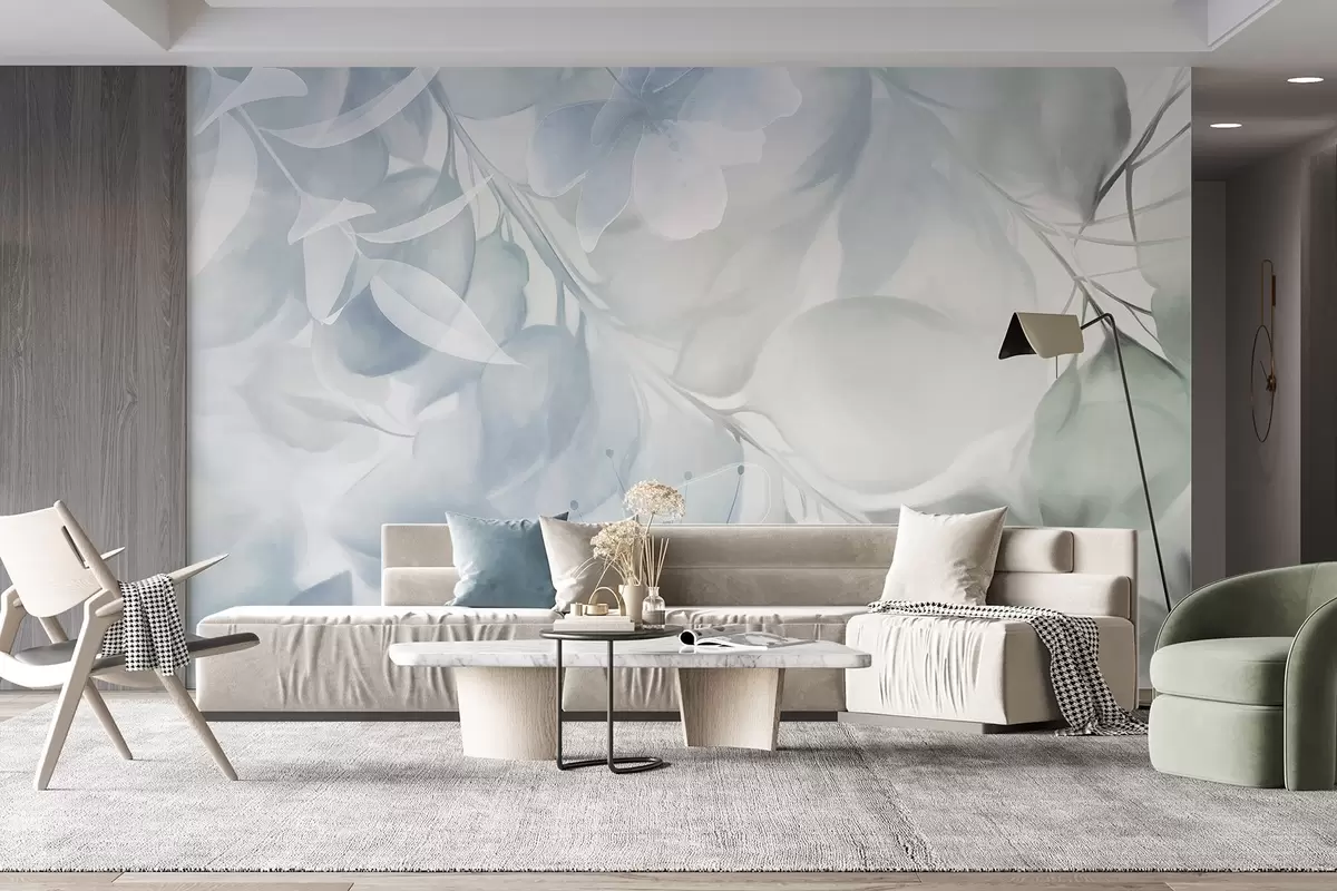 Fototapet Artă florală cu flori, frunze și ramuri în nuanțe discrete de albastru și verde, culori pastelate delicate, efect texturat de acuarelă Nr. w09397v1