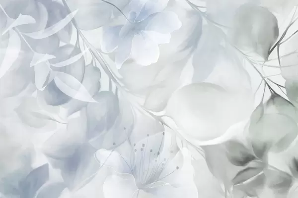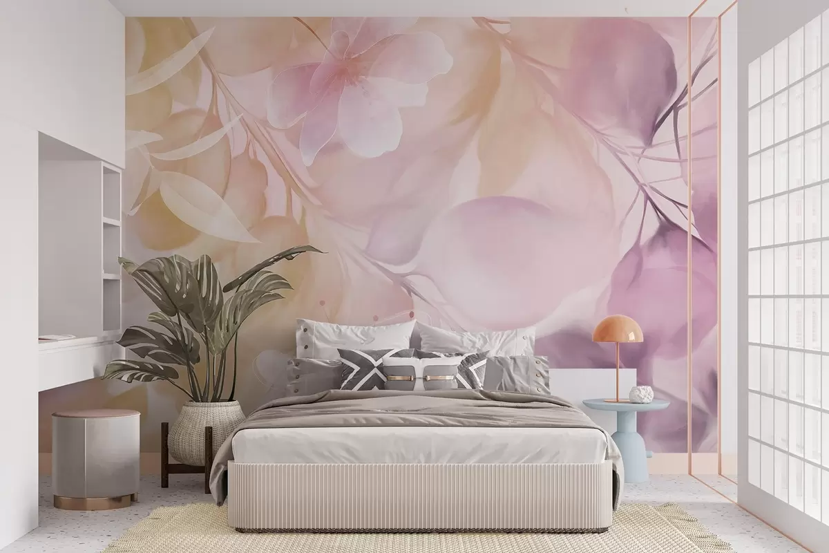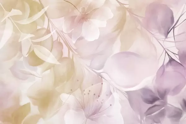 Fototapet Artă florală cu flori, frunze și ramuri în nuanțe discrete de galben și violet, culori pastelate delicate, efect de textură acuarelă Nr. w09397v2