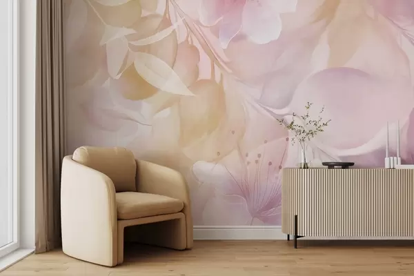 Fototapet Artă florală cu flori, frunze și ramuri în nuanțe discrete de galben și violet, culori pastelate delicate, efect de textură acuarelă Nr. w09397v2