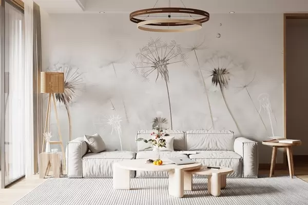 Fototapet Păpădii cu picături de apă, fundal alb, prim-plan, lumină difuză, natură, botanică, eterică, delicată, minimalistă Nr. w09399