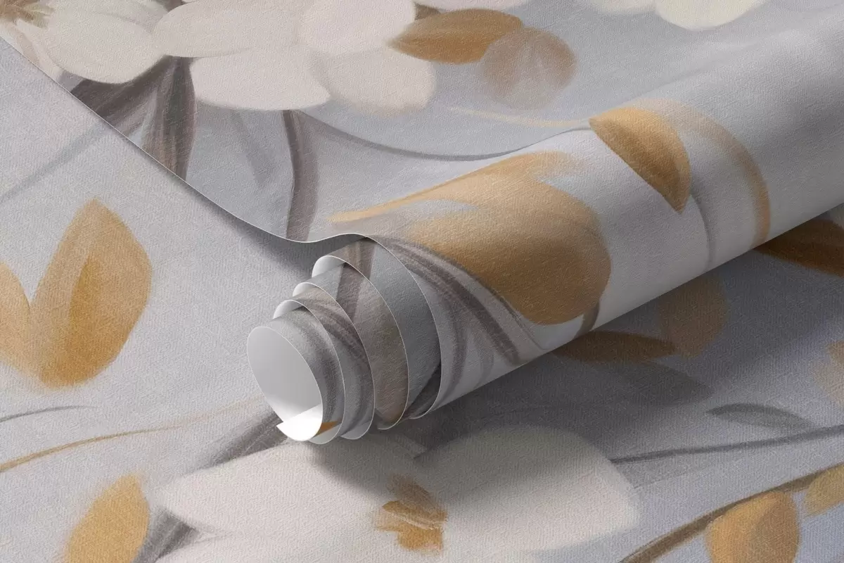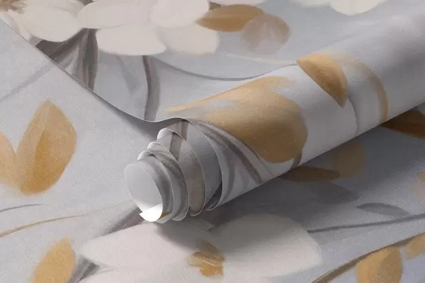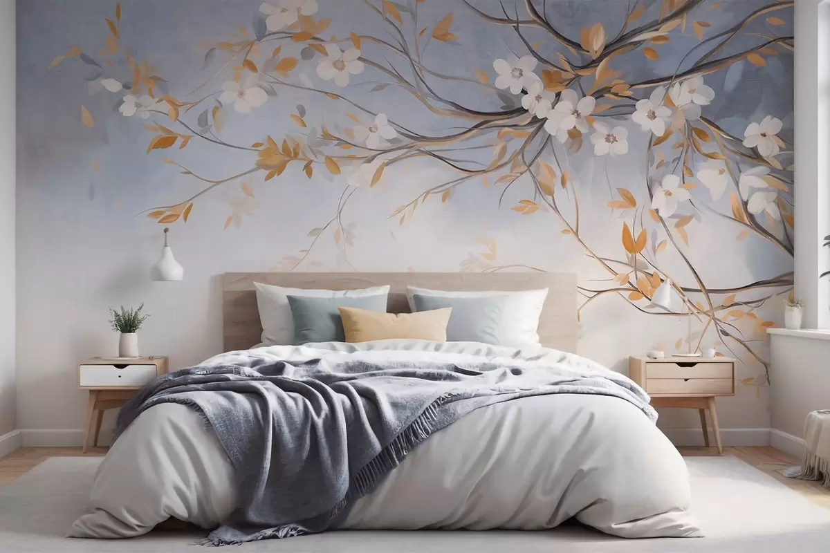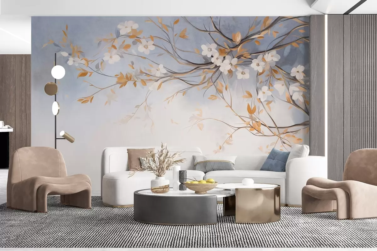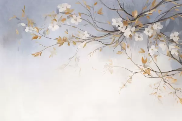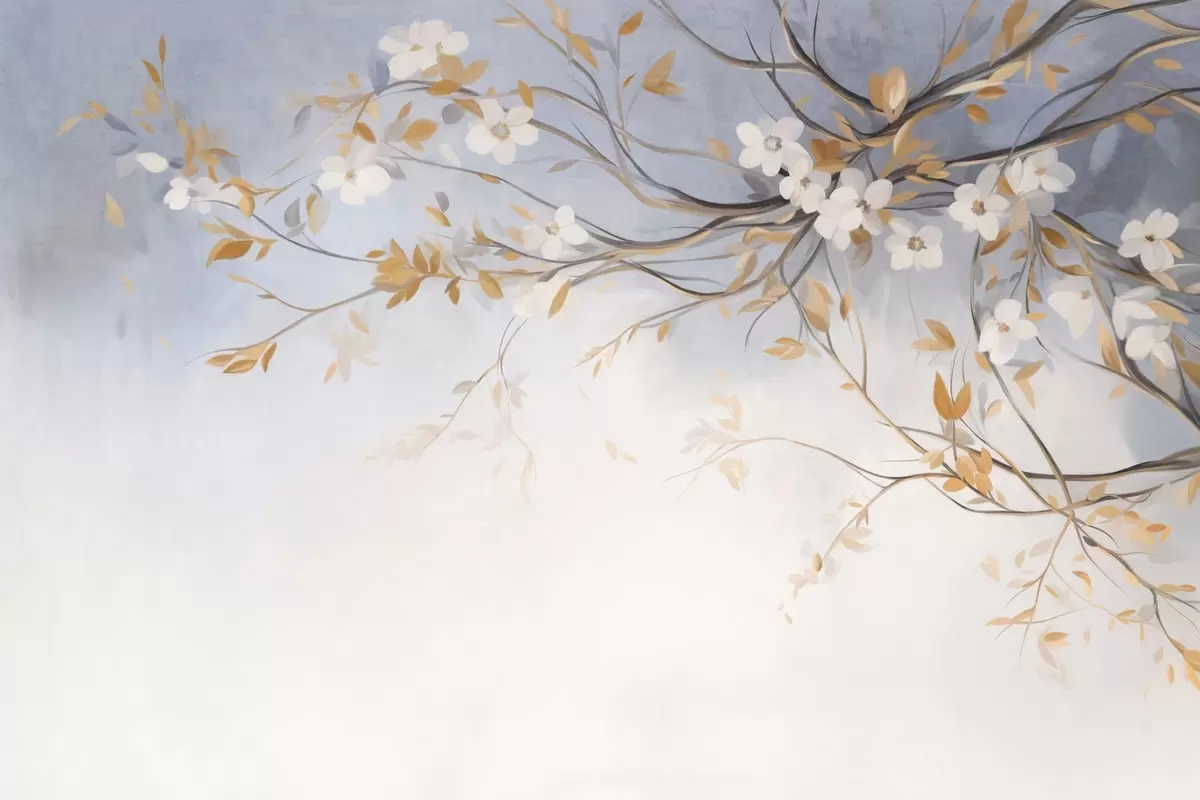 Fototapet Flori albe cu frunze portocalii pe o ramură de copac, fundal texturat albastru deschis, tușe delicate Nr. w09415