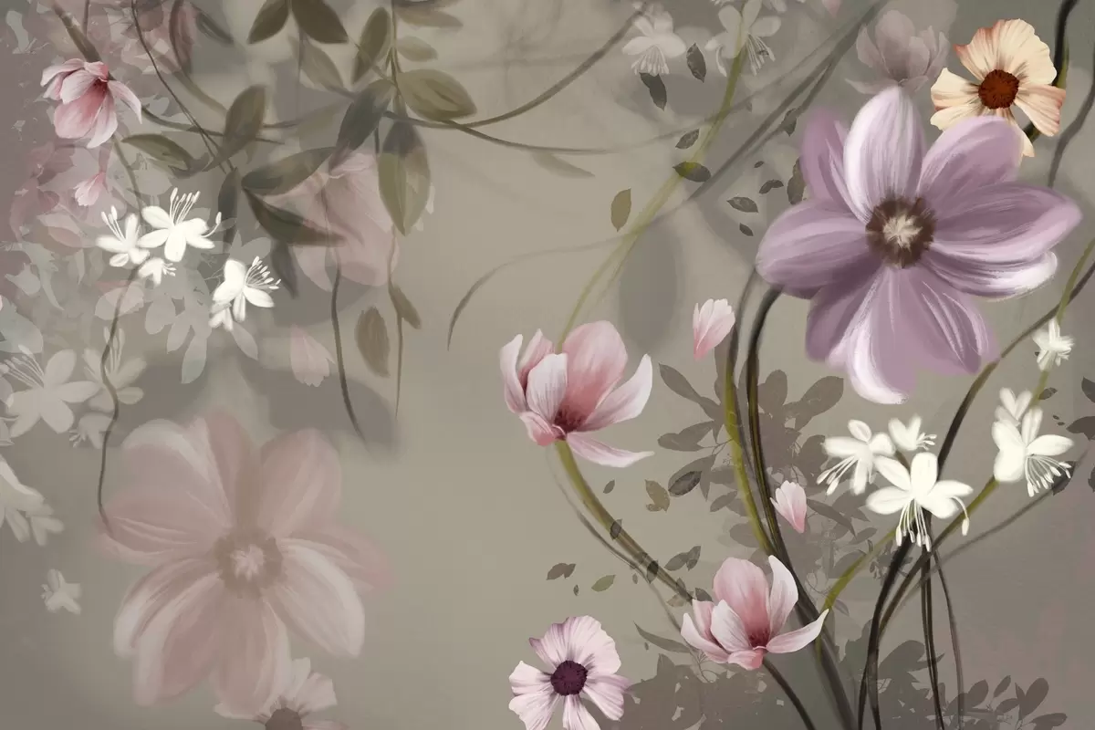 Fototapet Flori roz și albe cu tulpini și frunze maronii, lumină difuză, culori discrete, aranjament floral Nr. w09417
