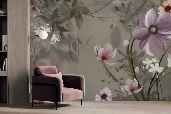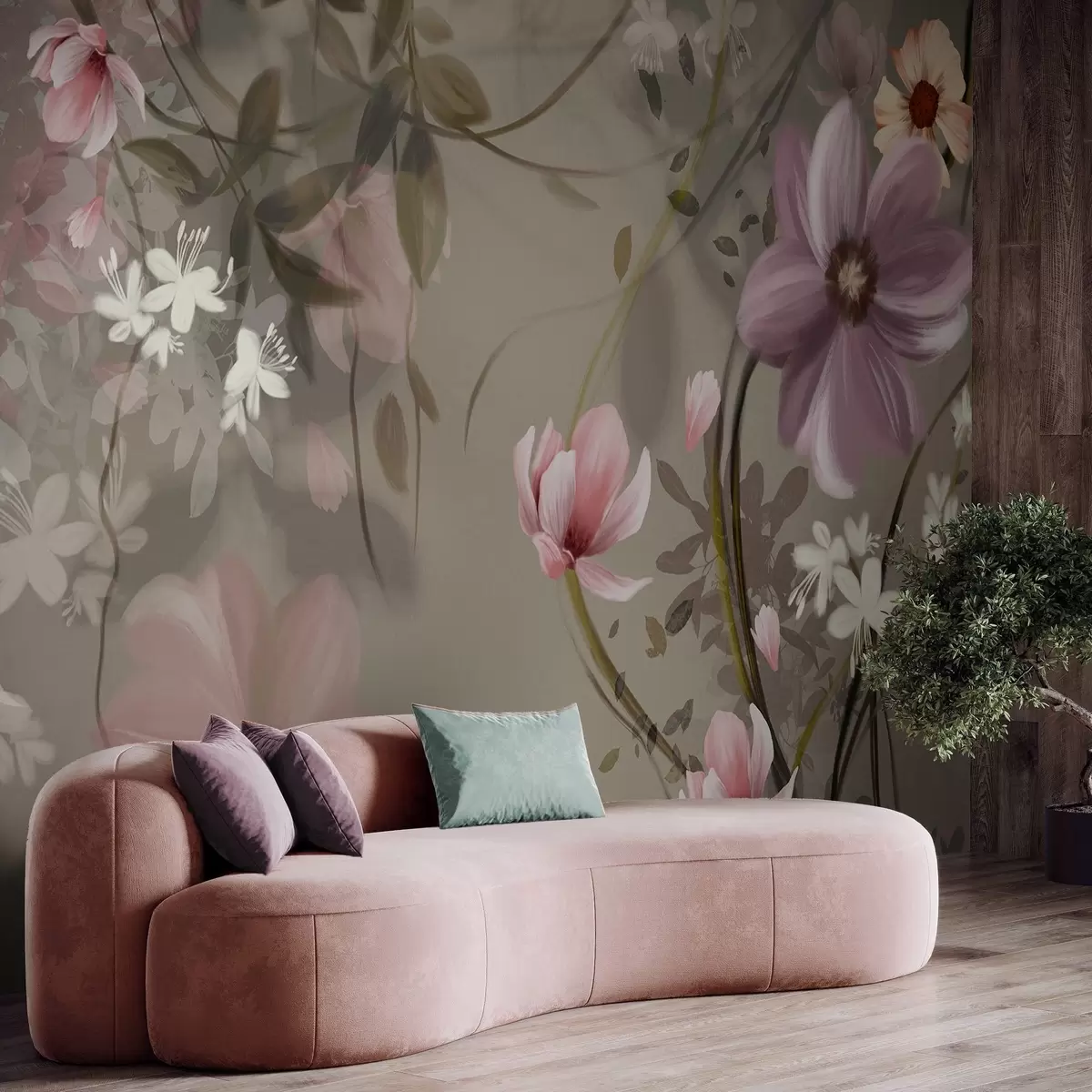 Fototapet Flori roz și albe cu tulpini și frunze maronii, lumină difuză, culori discrete, aranjament floral Nr. w09417