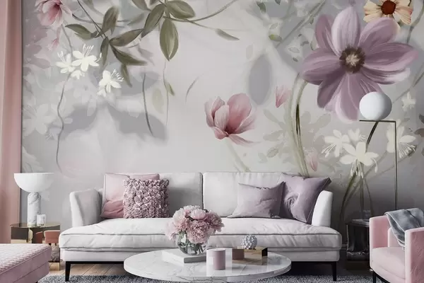 Fototapet Flori roz și albe cu tulpini și frunze verzi, iluminare difuză, culori discrete, aranjament floral Nr. w09417v1