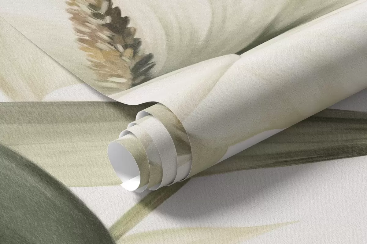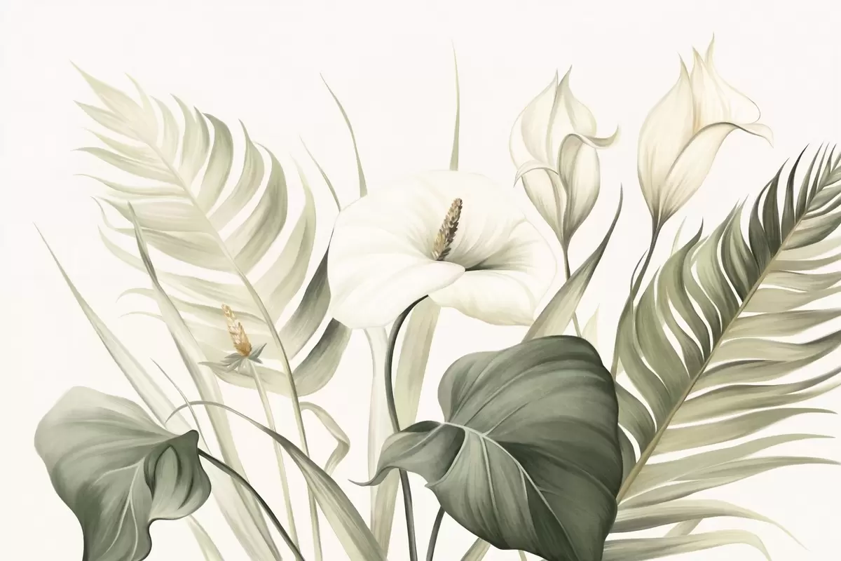 Fototapet Calla albe și frunze tropicale verzi, ilustrație botanică, fundal deschis, stil vintage, texturat Nr. w09423
