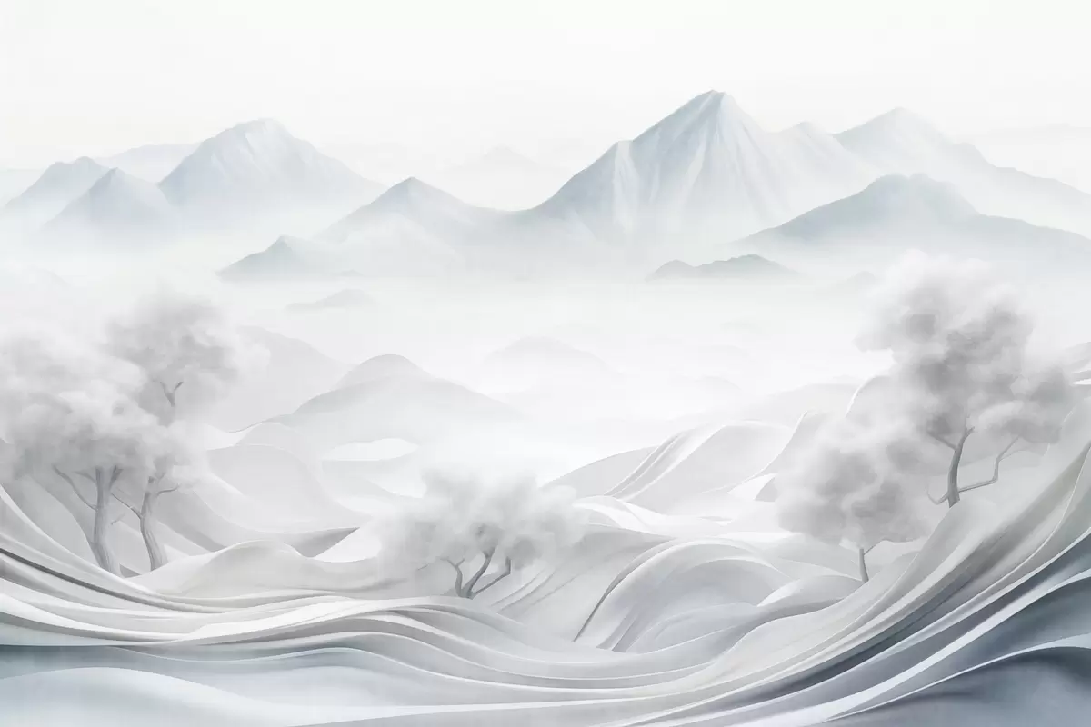Fototapet Peisaj montan abstract înzăpezit, cu copaci albi și ceață, stil minimalist texturat Nr. w09426