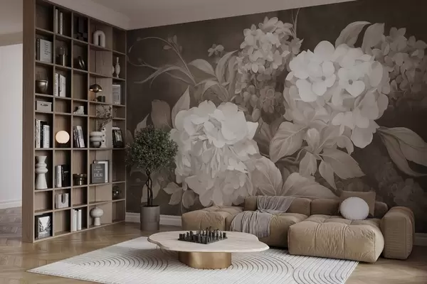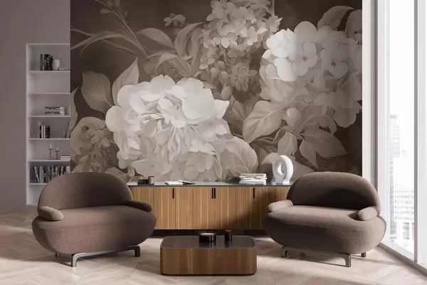 Fototapet Pictură texturată în sepia, imitație de flori de hortensie cu frunze mari, fundal abstract și întunecat Nr. w09465