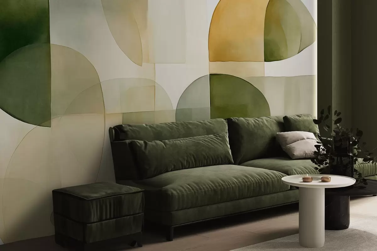 Fototapet Forme abstracte texturate în nuanțe de verde și galben, tonuri discrete, compoziție minimalistă, fundal neutru Nr. w09467