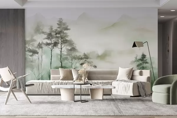 Fototapet Peisaj încețoșat cu copaci înalți și munți în tonuri discrete de verde și gri, stil minimalist, texturat Nr. w09469