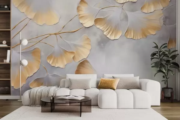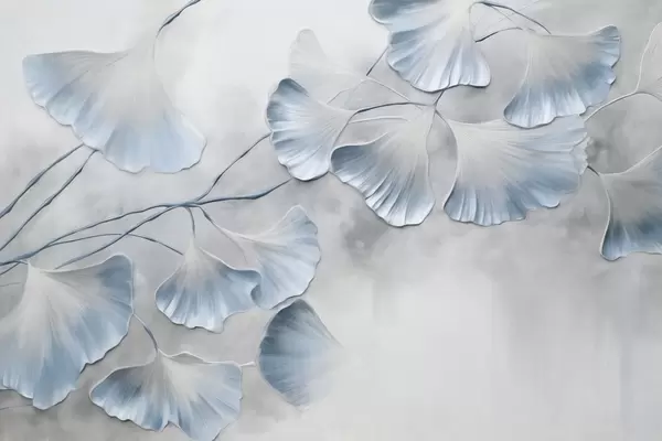 Fototapet Frunze de Ginkgo biloba cu margini galbene pe o ramură, fundal texturat gri, design elegant și minimalist Nr. w09472