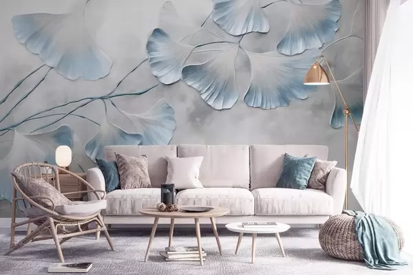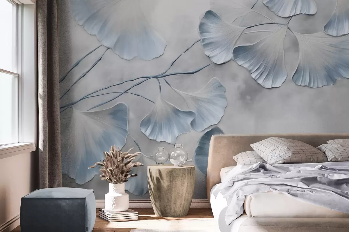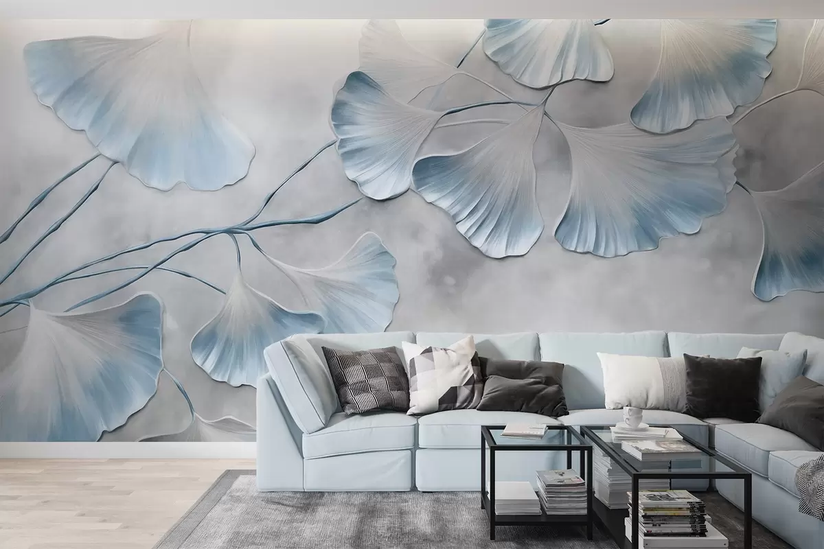 Fototapet Frunze de Ginkgo biloba cu margini albastre pe o ramură, fundal texturat gri, design elegant și minimalist Nr. w09472v1