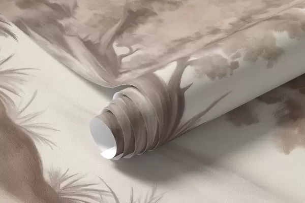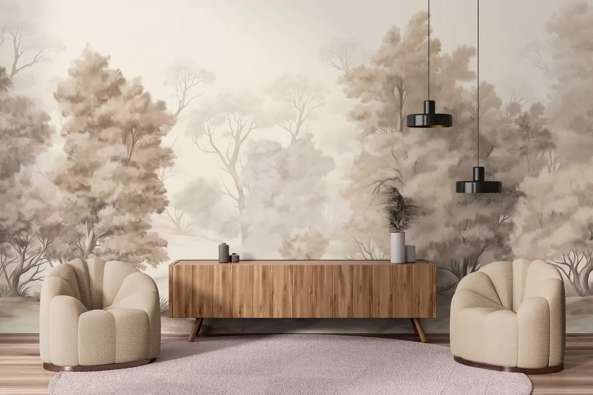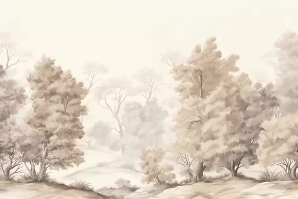 Fototapet Pictură texturată care imită un peisaj forestier cu copaci înalți și iarbă, culori discrete și delicate, scenă liniștitoare Nr. w09474