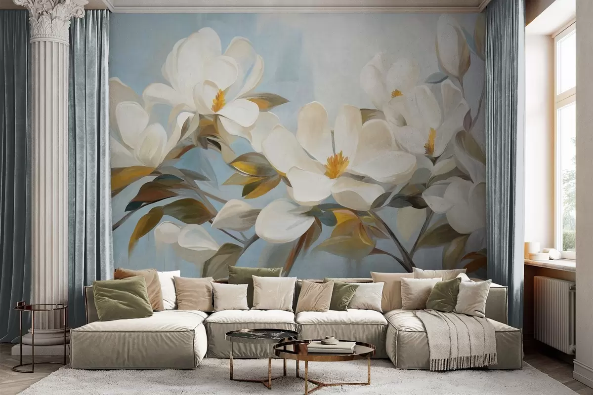 Fototapet Magnolii albe cu frunze verzi pe un fundal albastru deschis cu imitație de pensule abstracte Nr. w09478