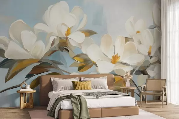 Fototapet Magnolii albe cu frunze verzi pe un fundal albastru deschis cu imitație de pensule abstracte Nr. w09478