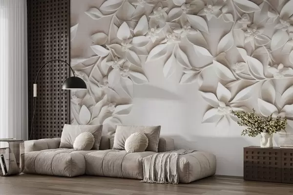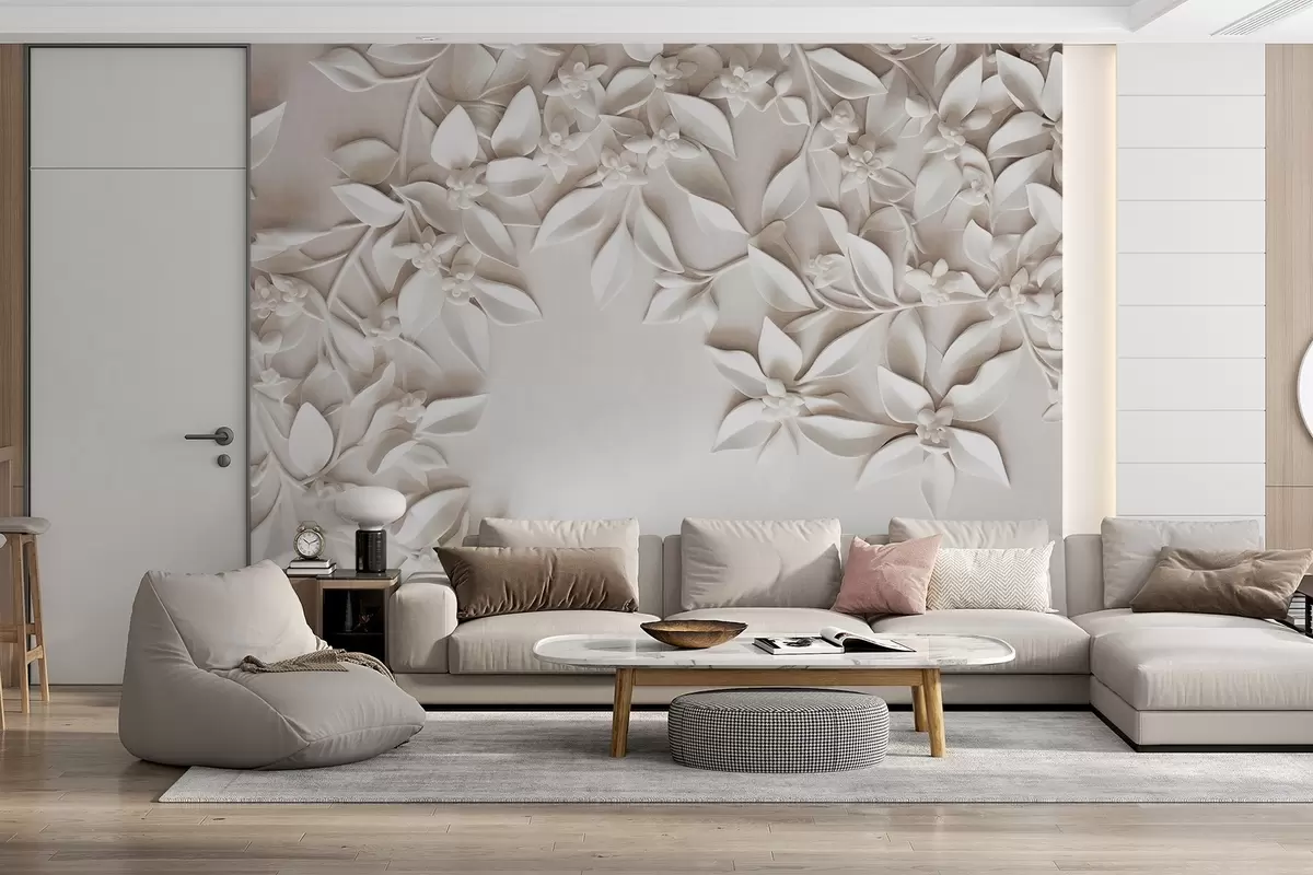 Fototapet Flori și frunze albe texturate, aranjament floral, design elegant, stil minimalist, artă decorativă Nr. w09479