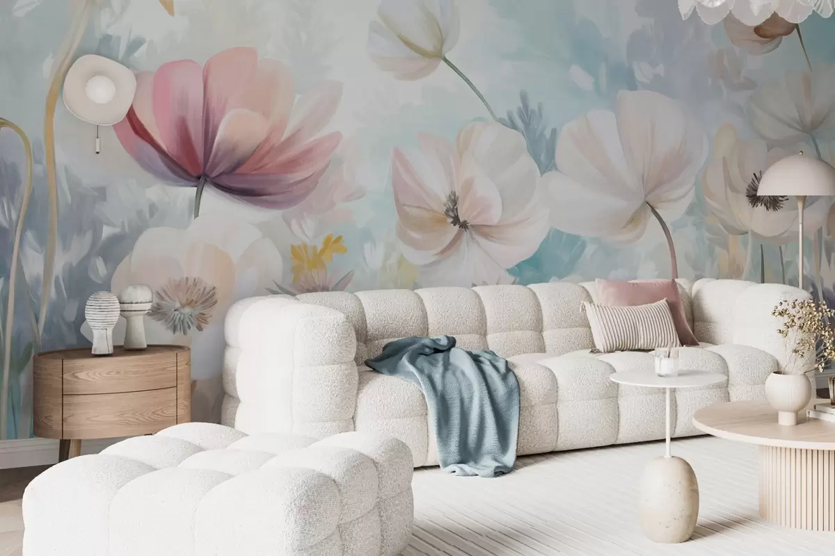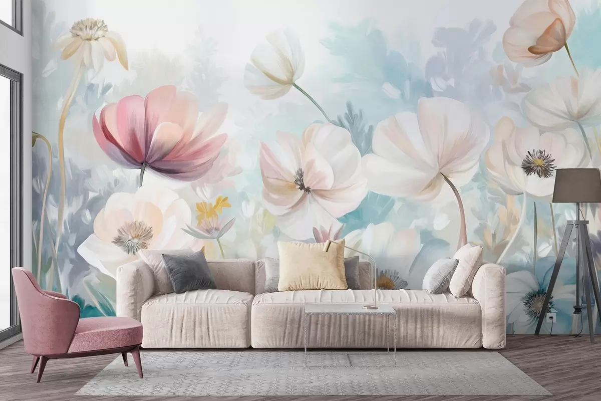 Fototapet Un câmp de flori în culori pastelate, cu petale delicate și frunze verzi delicate, într-un stil acuarelă visător și texturat Nr. w09481