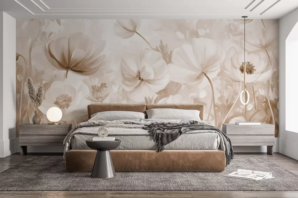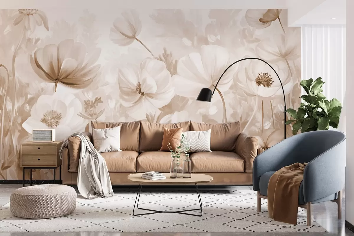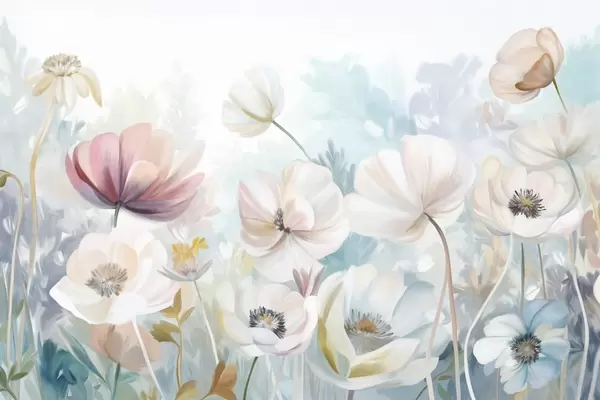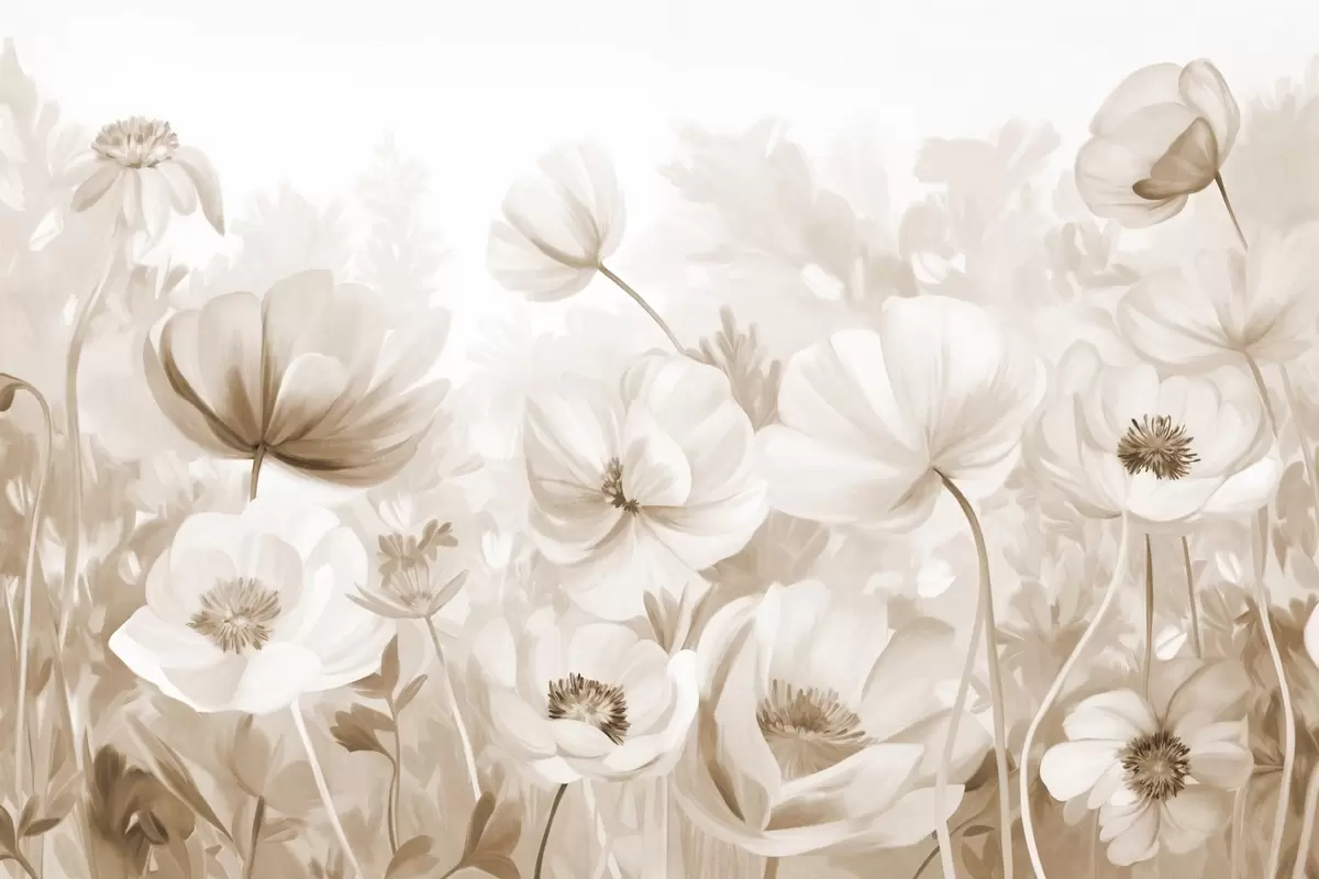 Fototapet Un câmp de flori bej cu petale delicate, frunze maro pal, într-un stil acuarelă visător, texturat Nr. w09481v1