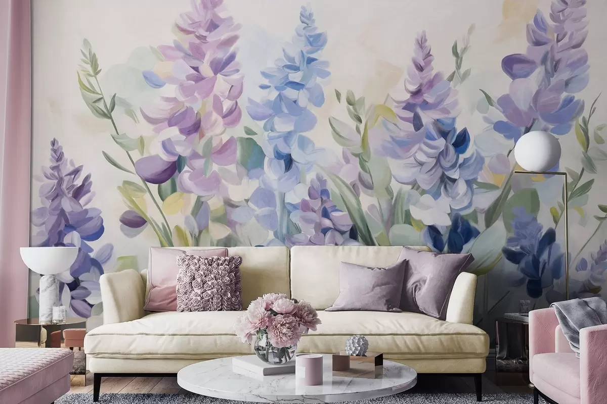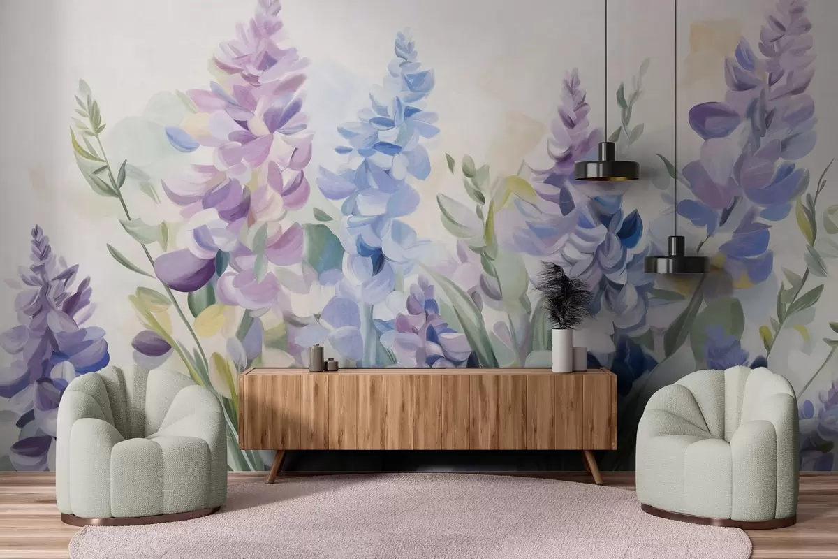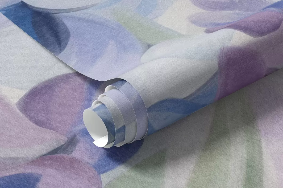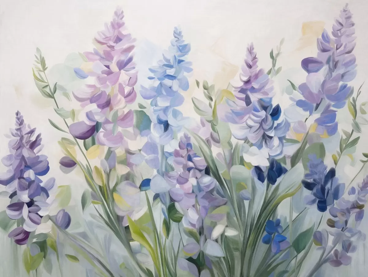 Fototapet Flori texturate violet și albastre cu frunze albastre, fundal deschis, pensule moi, culori vibrante Nr. w09482
