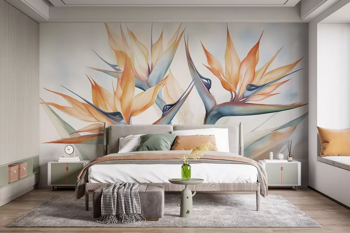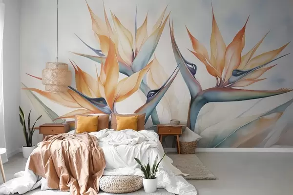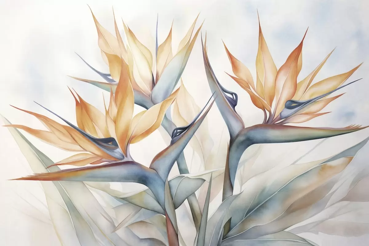 Fototapet Floarea păsării paradisului, strelitzia cu petale portocalii, stil texturat cu acuarelă delicată, fundal deschis Nr. w09483