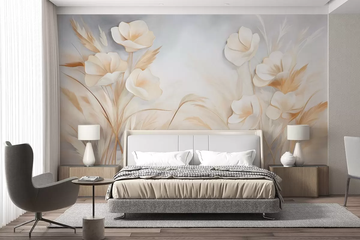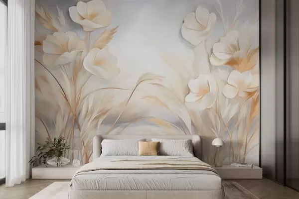 Fototapet Flori albe, stuf bej și iarbă pampas, texturat, elegant, stil minimalist, fundal abstract peisaj Nr. w09490