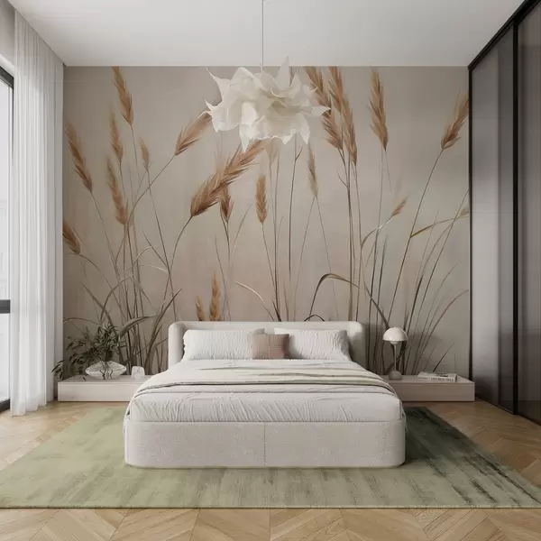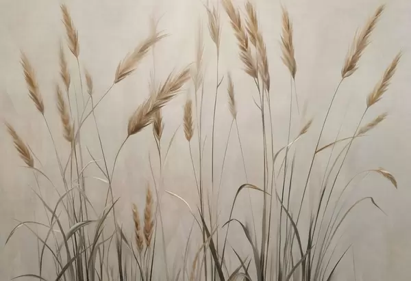 Fototapet Câmp cu textură de grâu cu spice galbene, fundal bej, iluminare naturală, tonuri calde, pensule detaliate Nr. w09493
