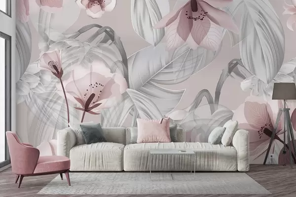 Fototapet Flori roz și frunze gri, fundal botanic floral, design elegant, culori delicate, detalii fine și delicate Nr. w09497