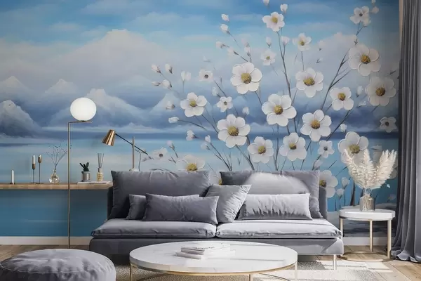 Fototapet Flori albe de primăvară lângă un lac înghețat, cu munți înzăpeziți, în stilul picturii în ulei Nr. w09526