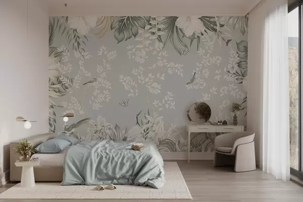 Fototapet Artă tropicală în culori pastelate, cu textură, cu păsări, fluturi, flori de hibiscus, frunze de palmier și copaci pe un fundal albastru deschis. Nr. w09528