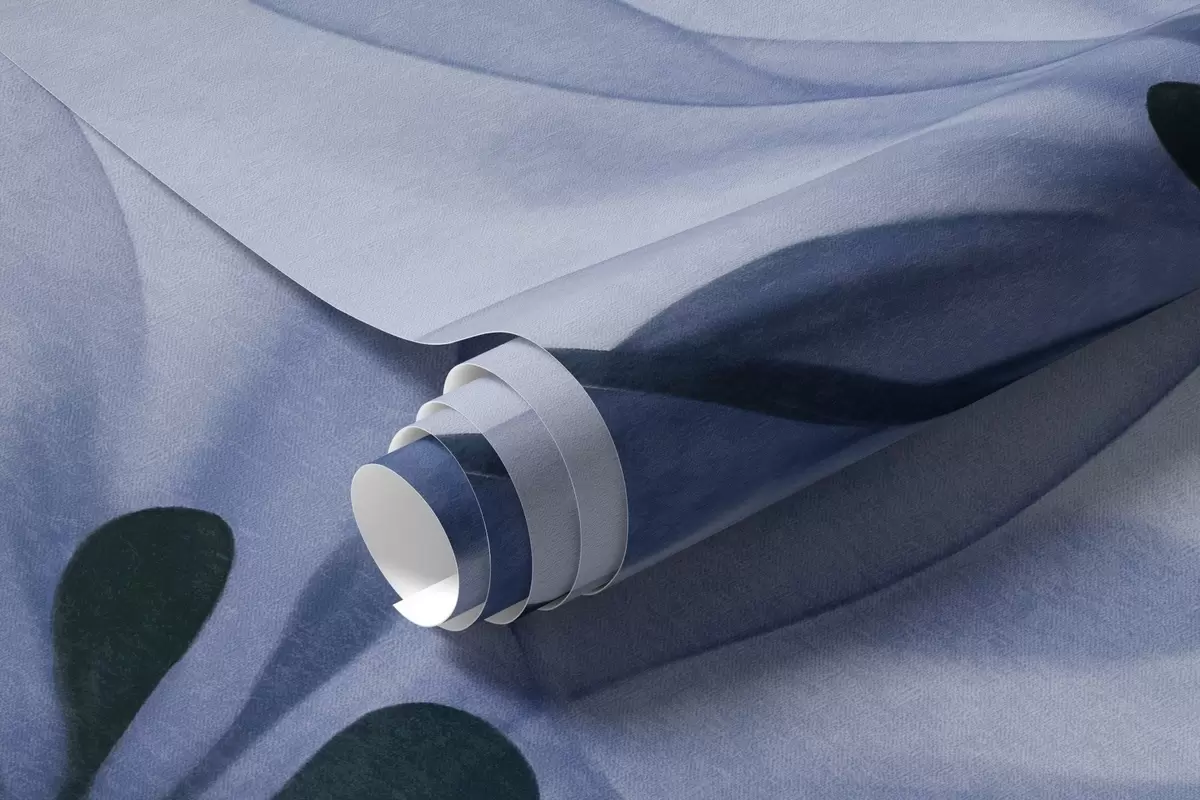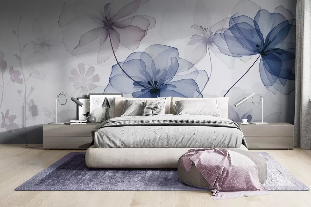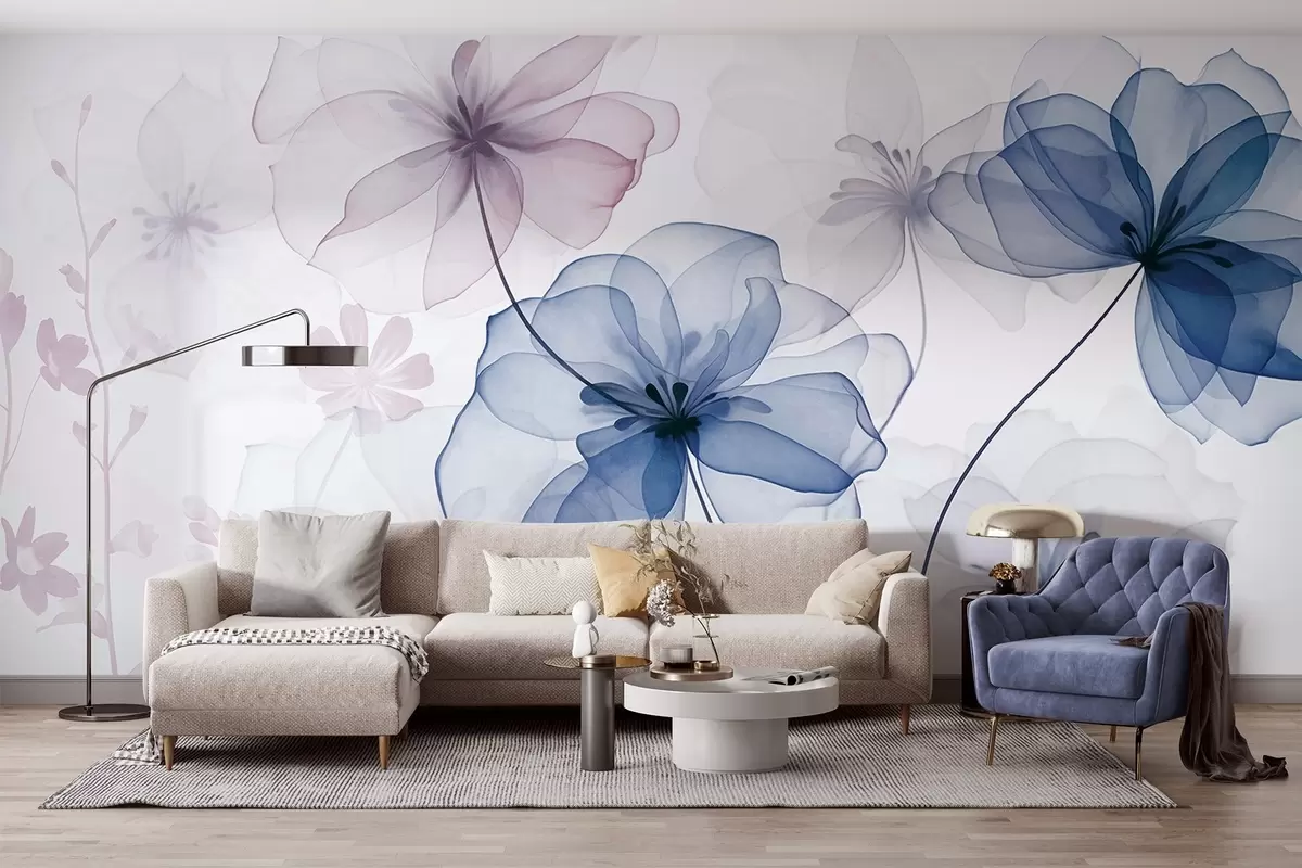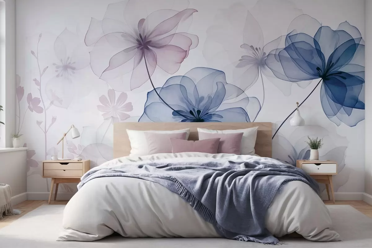 Fototapet Flori translucide cu petale albastre și roz discrete, tulpini lungi, fundal deschis, culori delicate, design floral texturat Nr. w09529v1