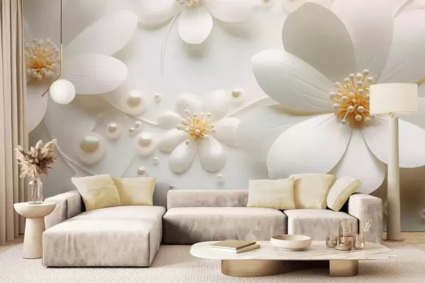 Fototapet Flori albe cu perle împrăștiate pe un fundal alb, design elegant și minimalist, texturat Nr. w09535