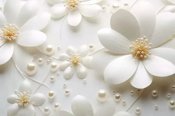 Fototapet Flori albe cu perle împrăștiate pe un fundal alb, design elegant și minimalist, texturat Nr. w09535