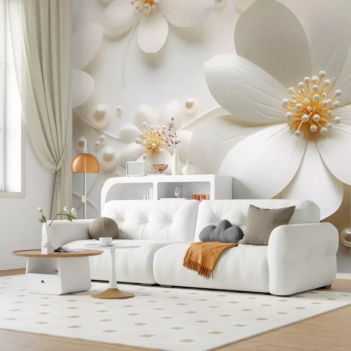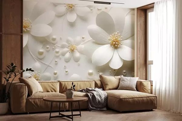 Fototapet Flori albe cu perle împrăștiate pe un fundal alb, design elegant și minimalist, texturat Nr. w09535
