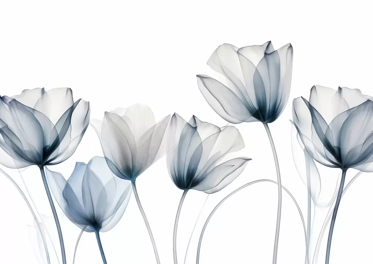 Fototapet Flori de lalea albastre și albe translucide, cu tulpini lungi, pe fundal deschis, artă florală delicată și texturată Nr. w09538