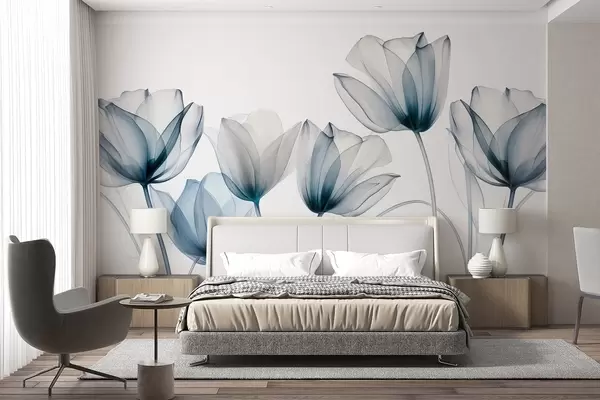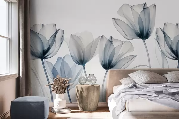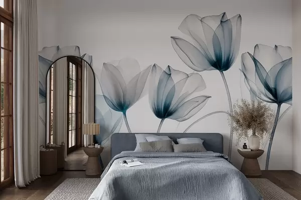 Fototapet Flori de lalea albastre și albe translucide, cu tulpini lungi, pe fundal deschis, artă florală delicată și texturată Nr. w09538