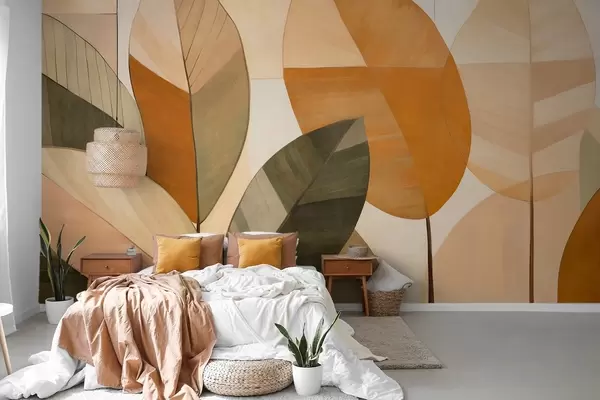 Fototapet Frunze abstracte mari în nuanțe de portocaliu, maro și verde, texturate, dispuse pe un fundal deschis. Nr. w09539