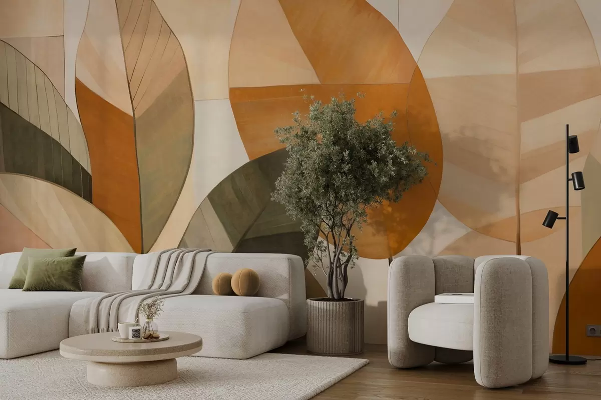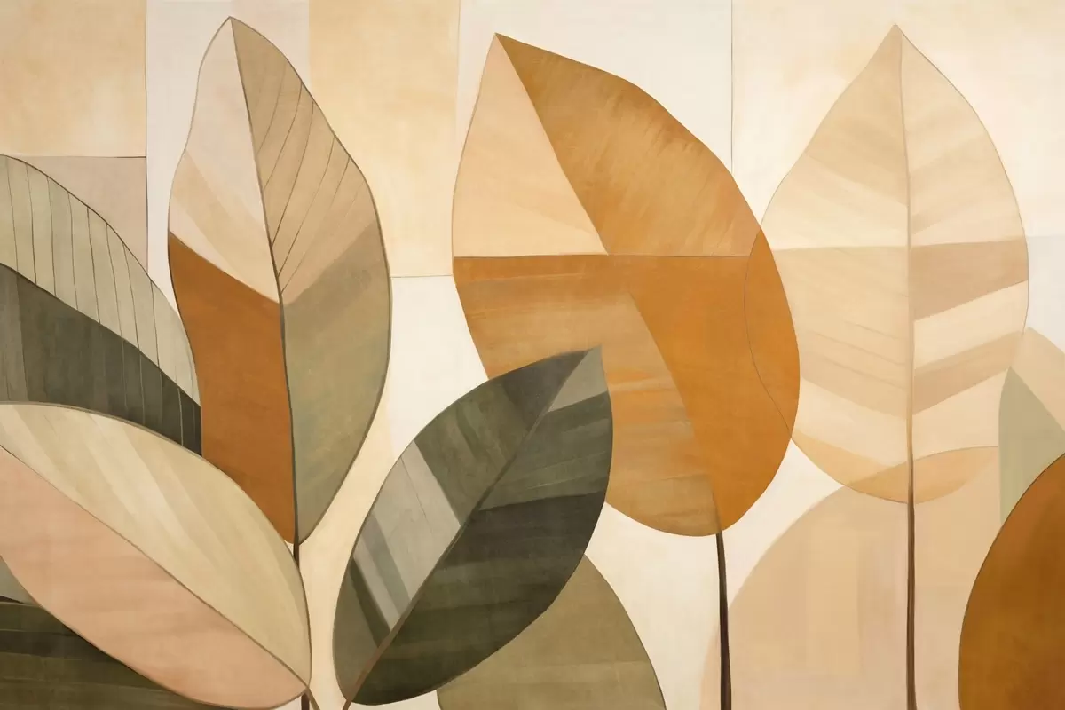 fototapet Frunze abstracte mari în nuanțe de portocaliu, maro și verde, texturate, dispuse pe un fundal deschis. w09539